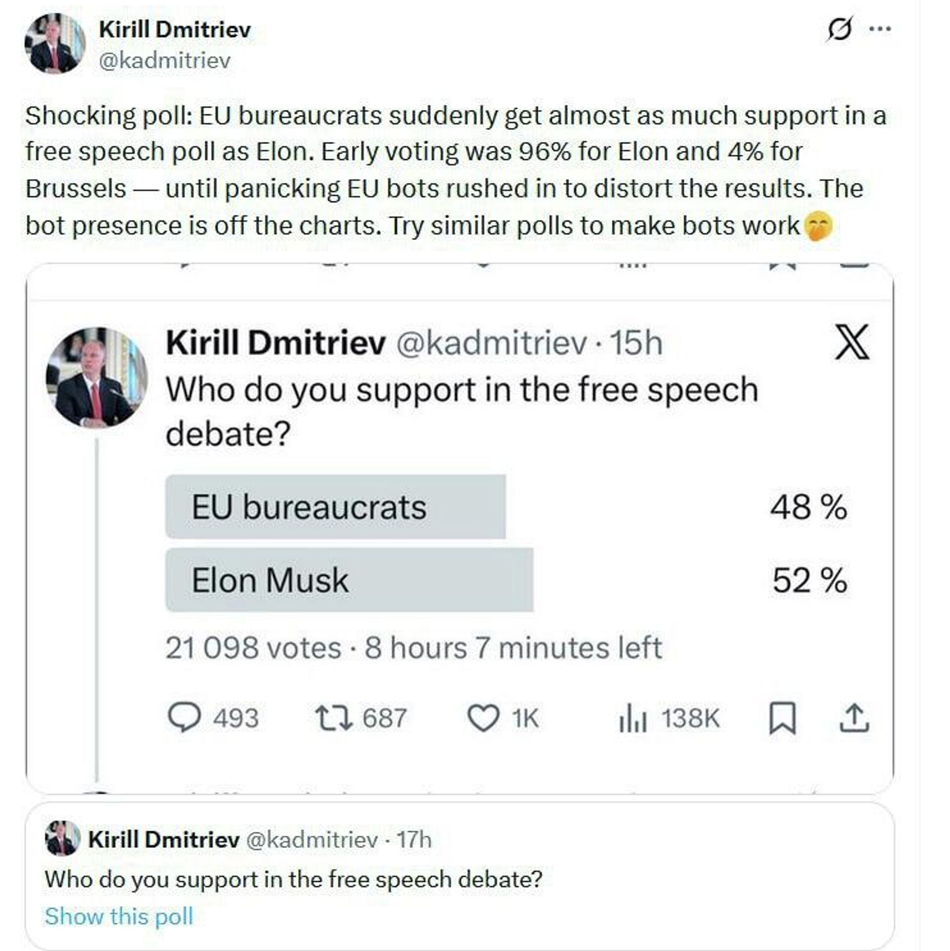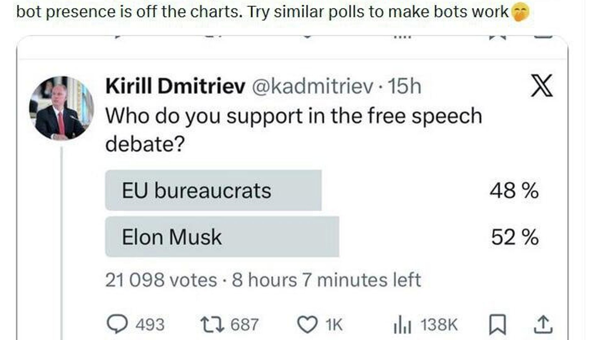 ▫کریل دمیتریف، رئیس صندوق سرمایهگذاری مستقیم روسیه و فرستاده ویژه رئیس جمهور روسیه، میگوید بروکراتهای اتحادیه اروپا ناگهان در نظرسنجی که او در ایکس راهاندازی کرده بود، به اندازه ایلان ماسک حمایت شدند.