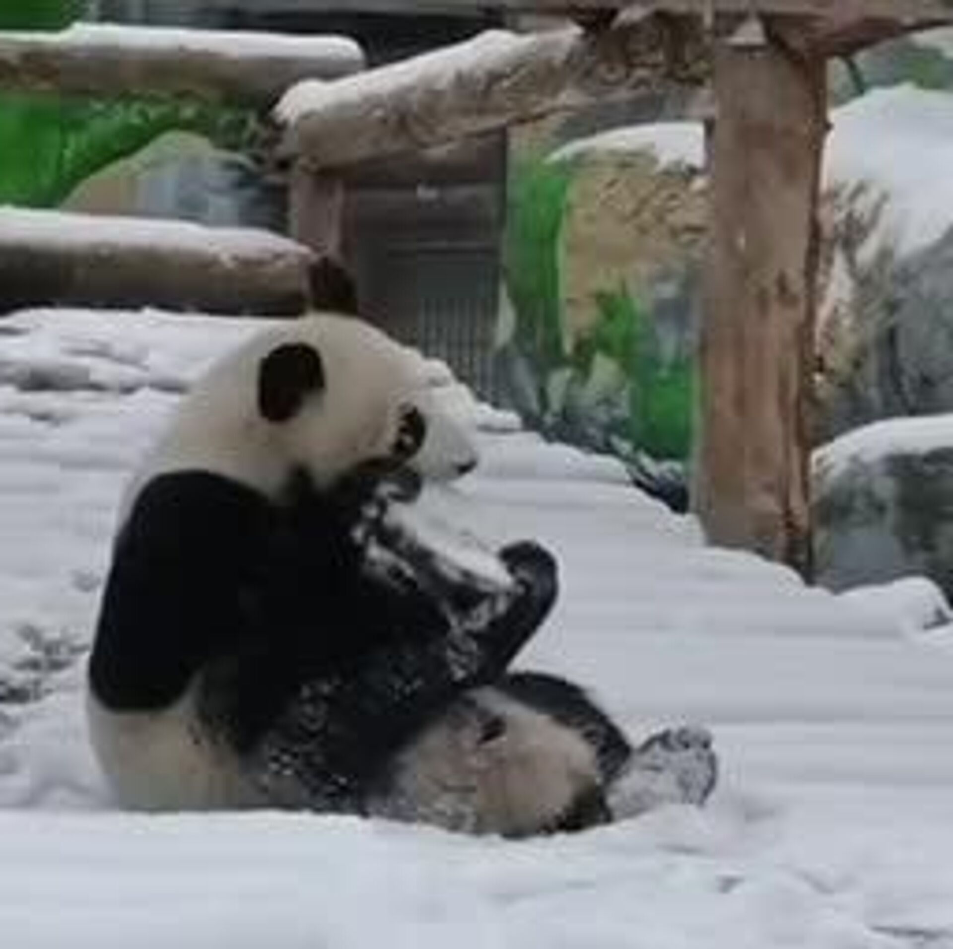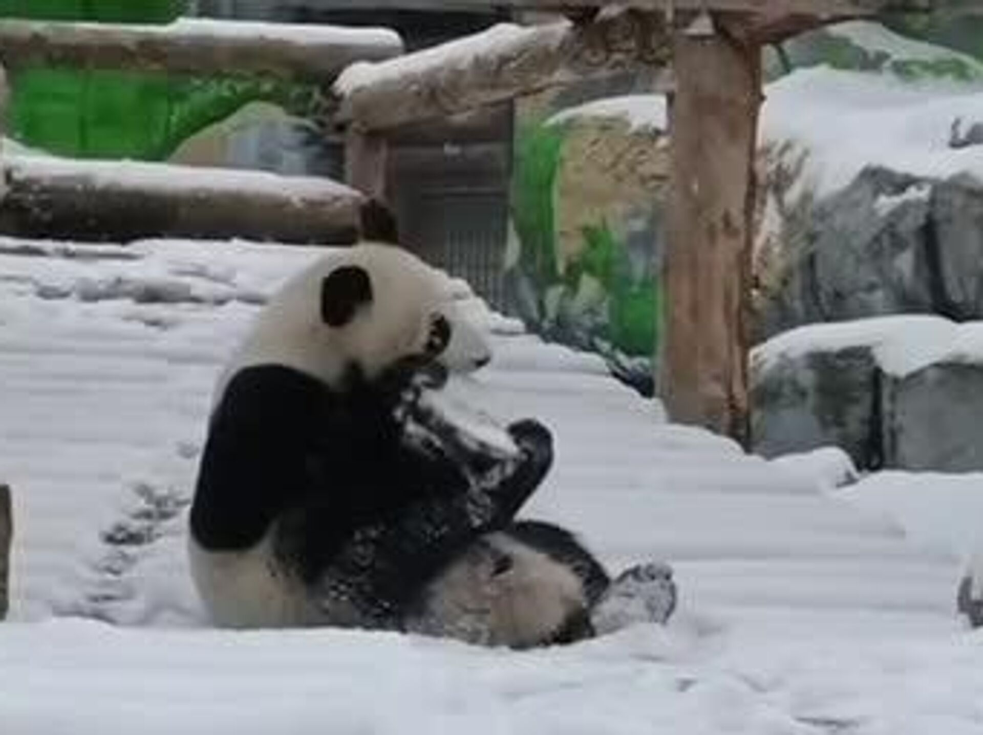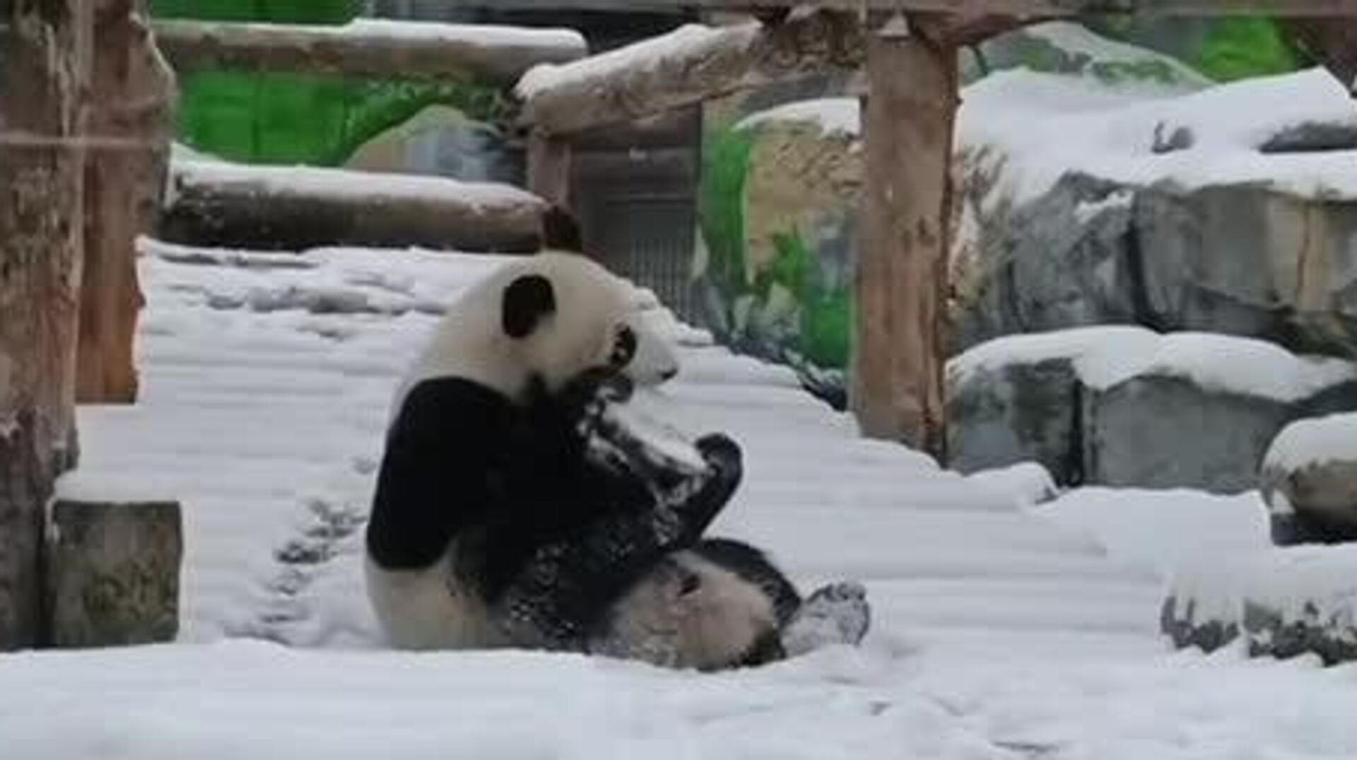 پاندای معروف روسی «کاتیوشا» از بارش برف در مسکو خوشحال است