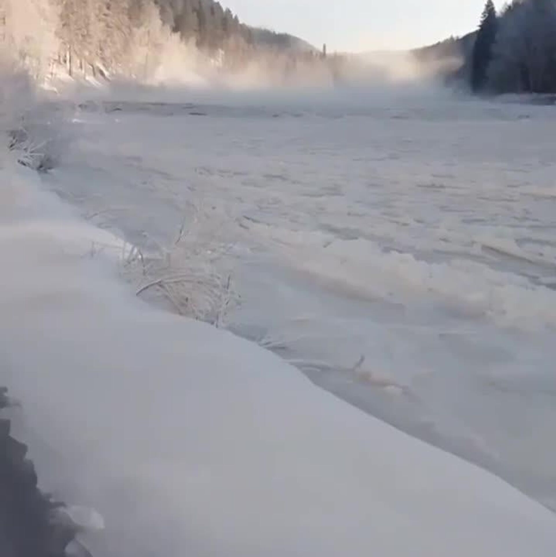 11:35 16.12.2025 (بروز رسانی شده: 11:40 16.12.2025) یک پدیده طبیعی نادر در بوریاتیای روسیه، سونامی یخی در رودخانه تورکا