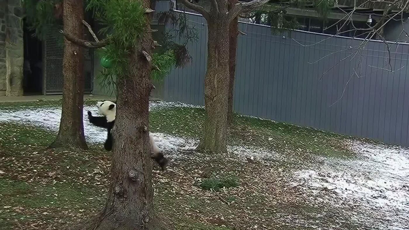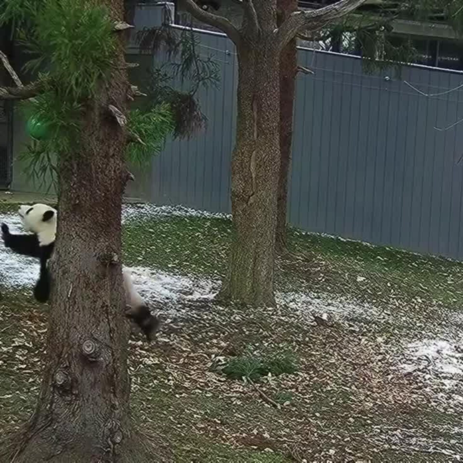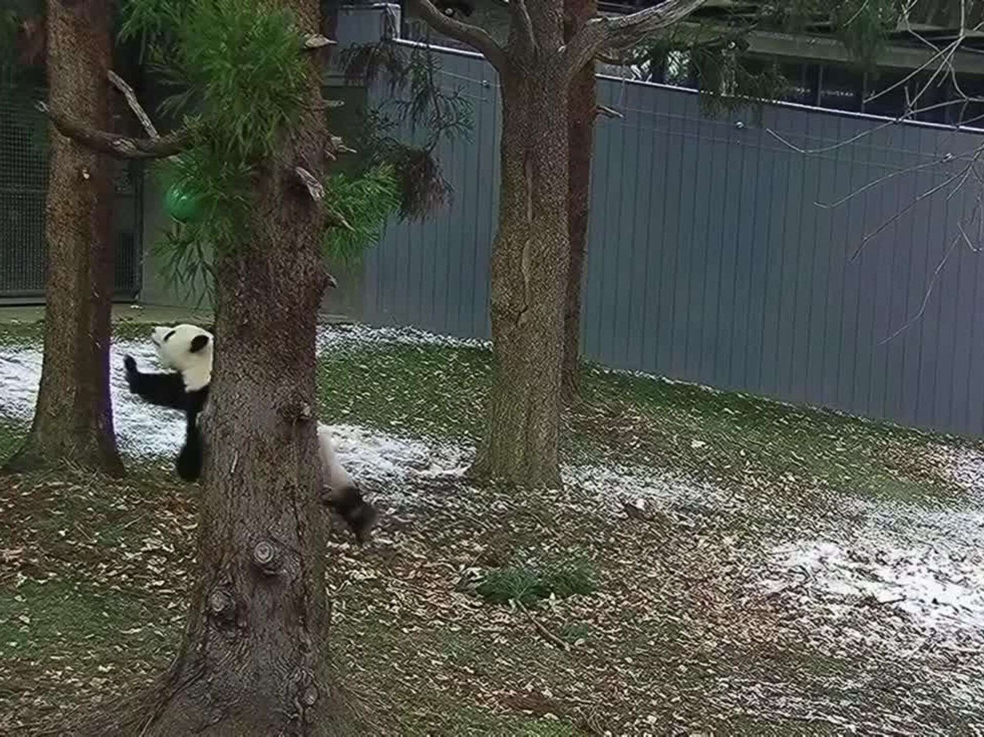 فیلمهایی از باغوحش نشان میدهد که پانداها در محوطه خود با اسباببازیها بازی میکنند و از میان لایه نازکی از اولین برف عبور میکنند.