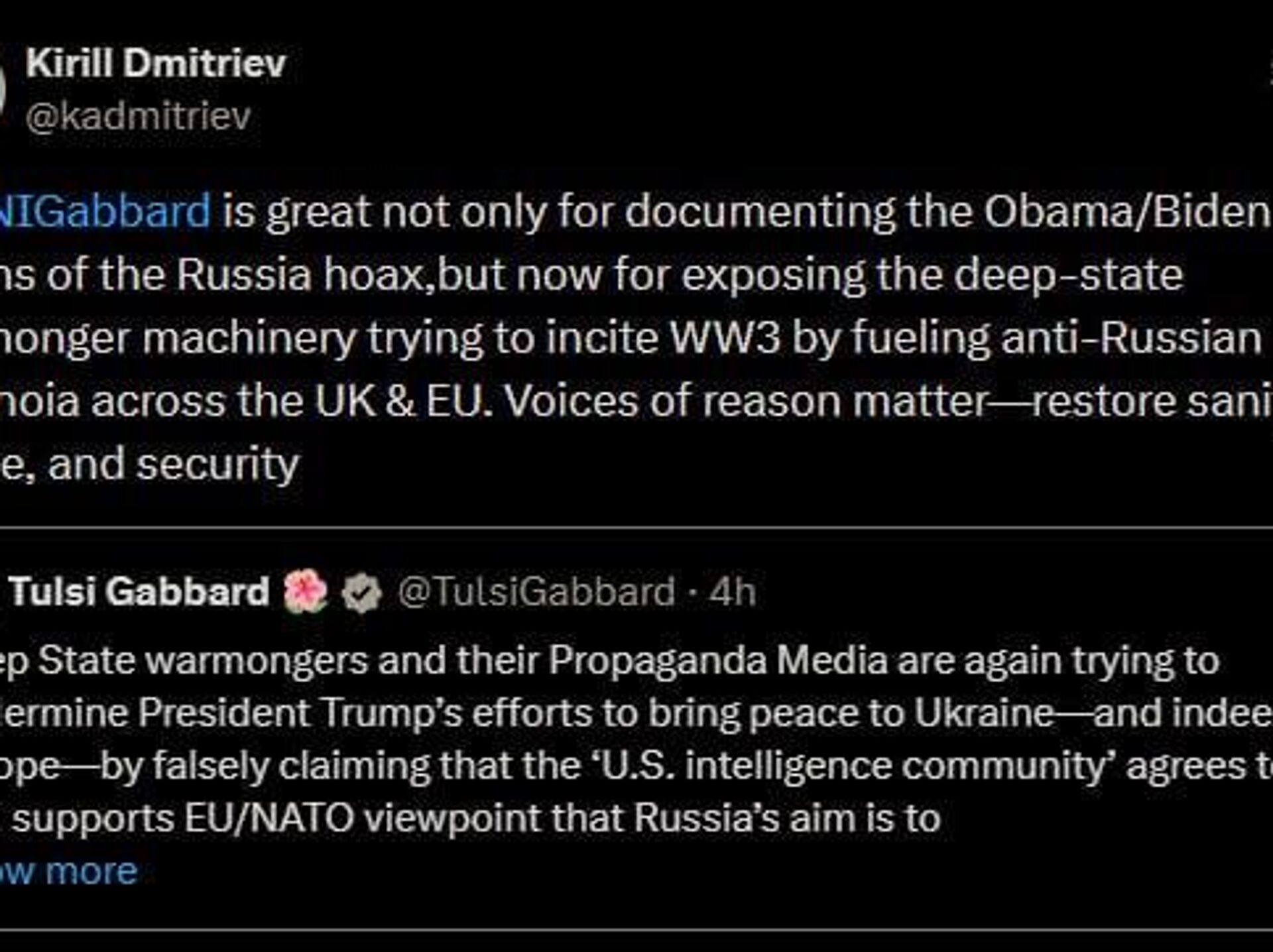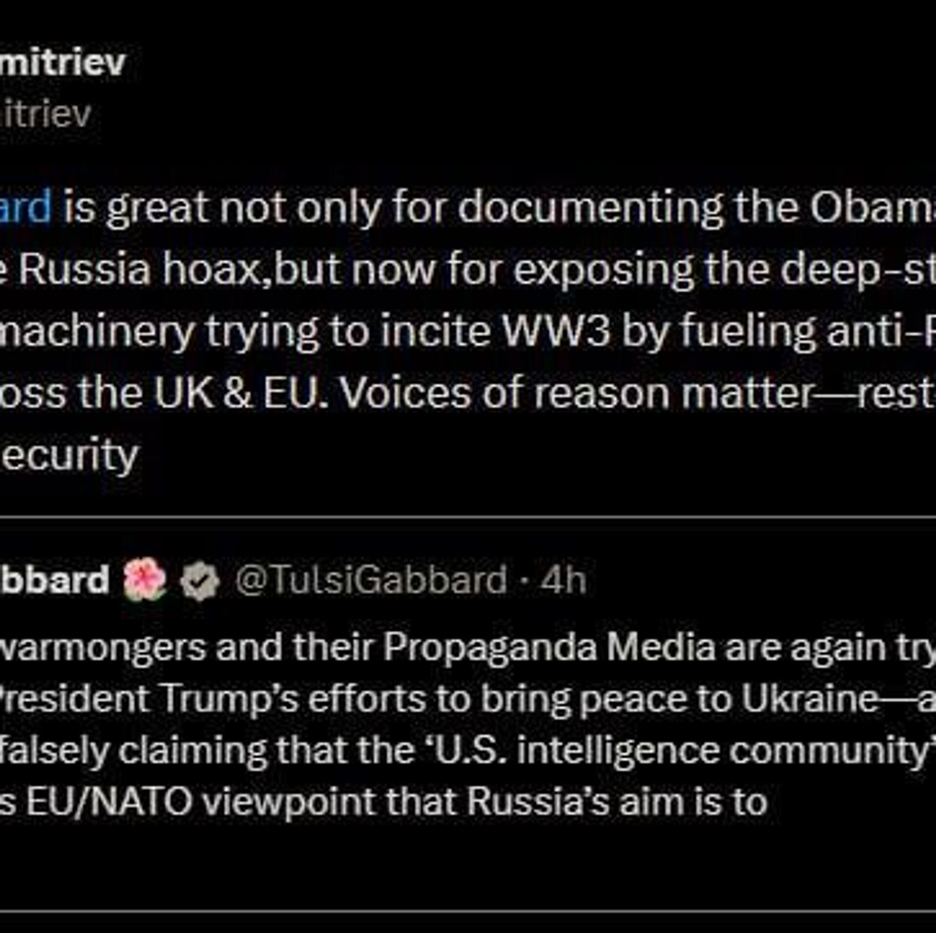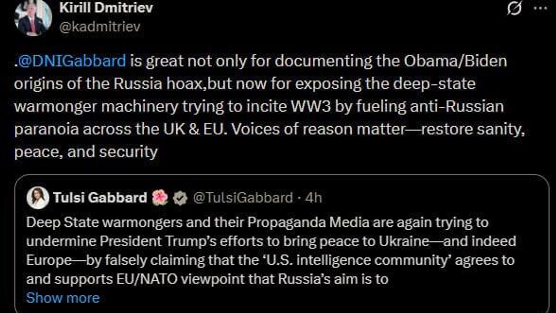 ▫دمیتریف درایکس نوشت: «صدای منطق مهم است - سلامت عقل، صلح و امنیت را بازگردانید».