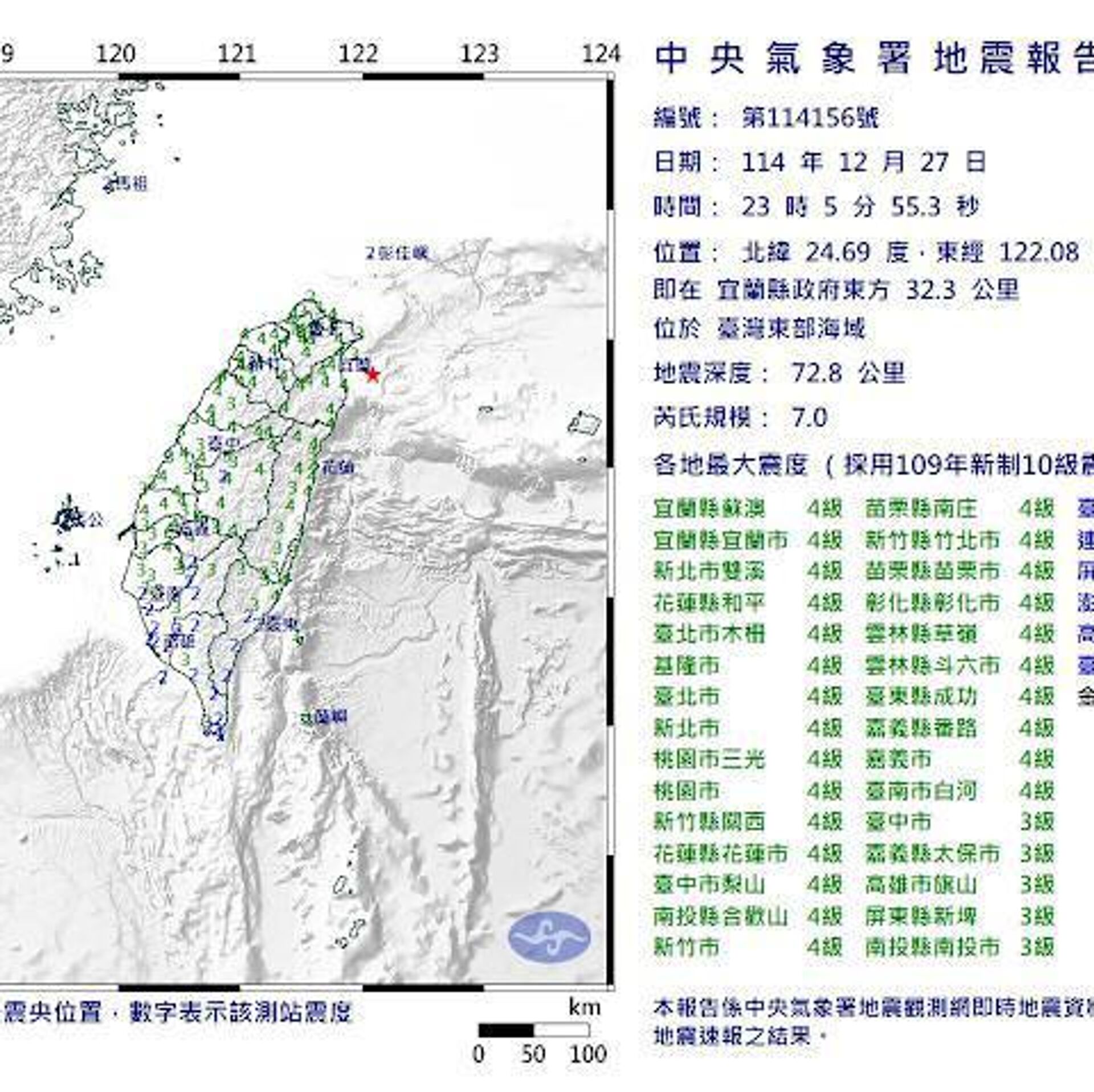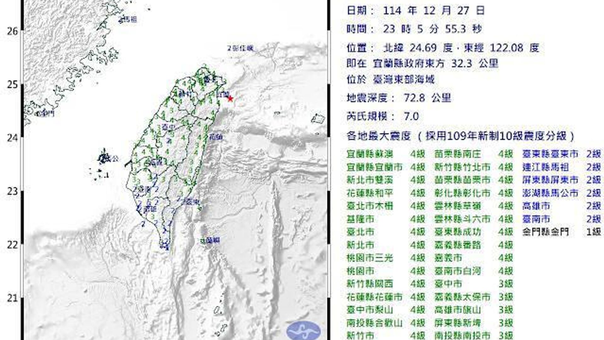 اداره هواشناسی مرکزی تایوان گزارش داد که زلزلهای به بزرگی 7 ریشتر سواحل این جزیره را لرزاند