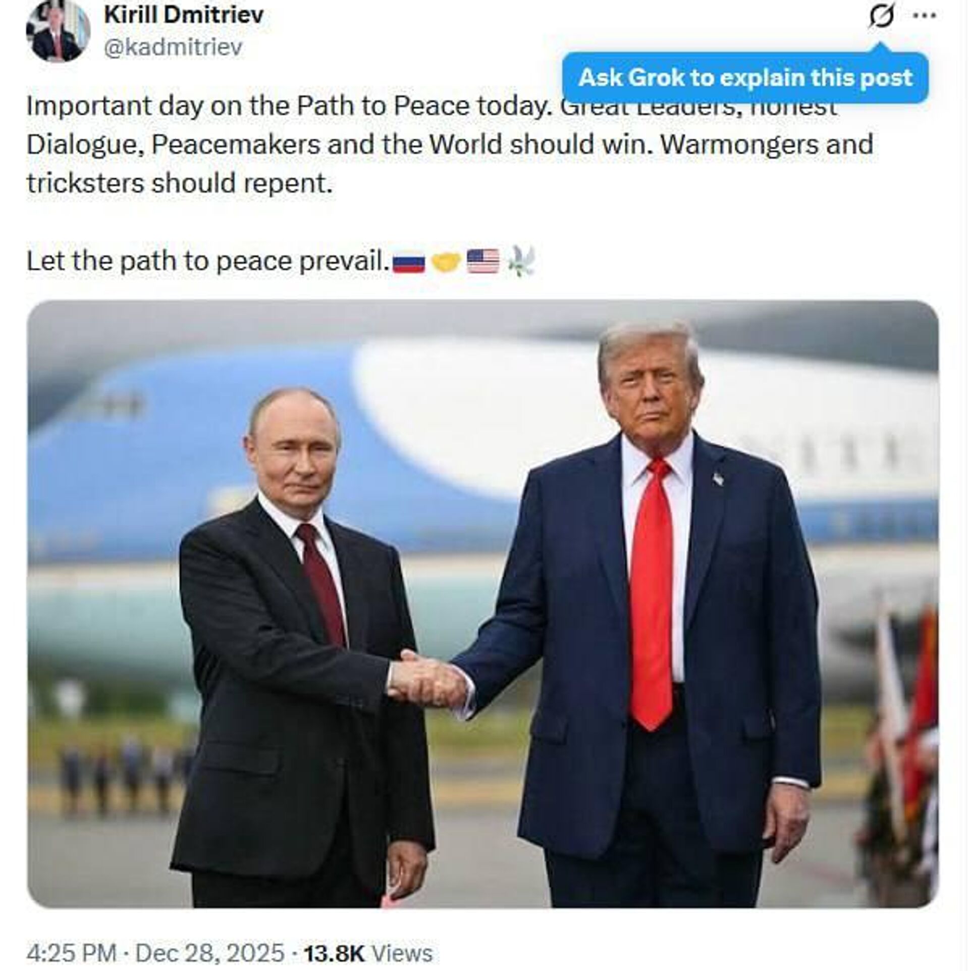18:47 28.12.2025 (بروز رسانی شده: 18:50 28.12.2025) فرستاده ویژه روسیه، عکسی از پوتین و ترامپ منتشر کرد: «بگذارید مسیر صلح پیروز شود»