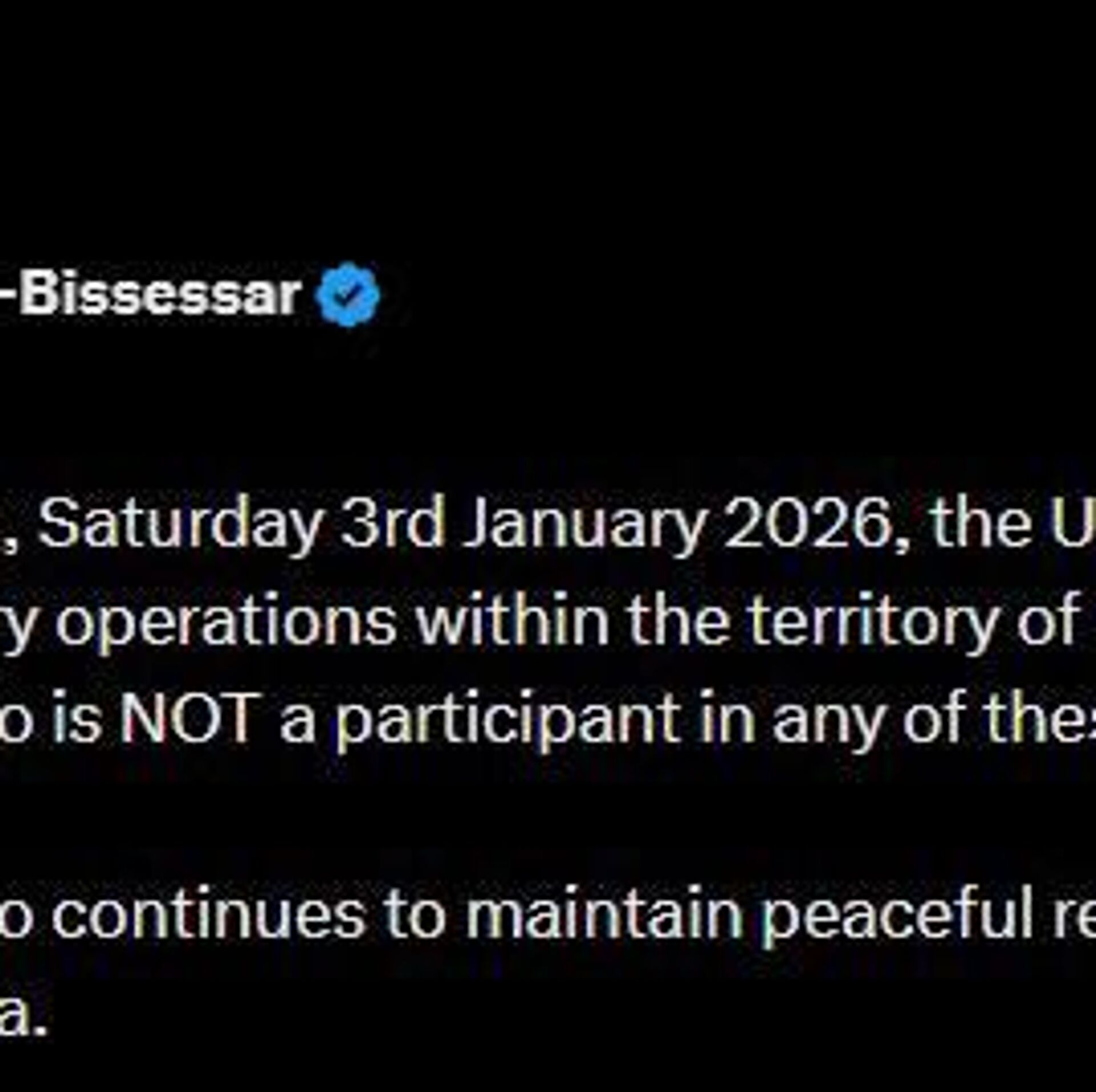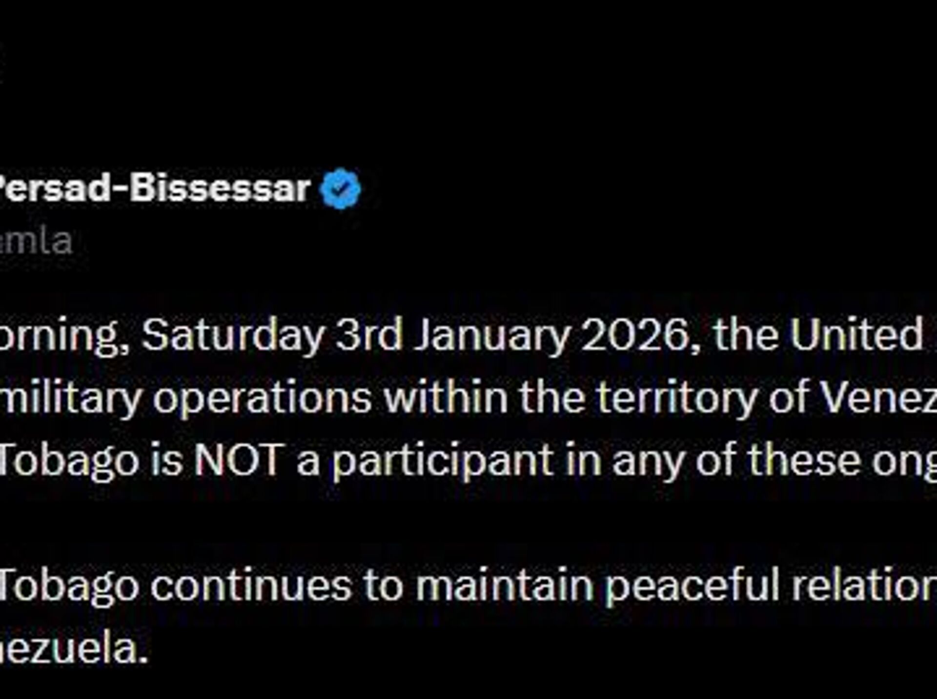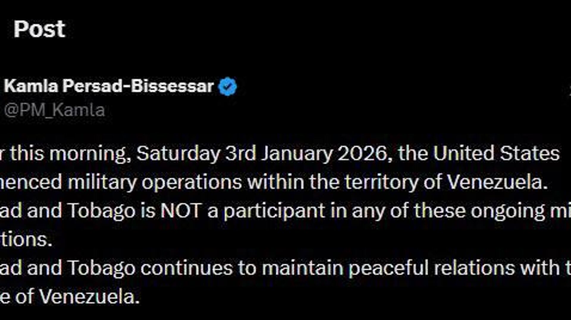 14:00 03.01.2026 (بروز رسانی شده: 14:10 03.01.2026) نخست وزیر ترینیداد و توباگو: صبح امروز، شنبه 3 ژانویه 2026، ایالات متحده عملیات نظامی را در خاک ونزوئلا آغاز کرد
