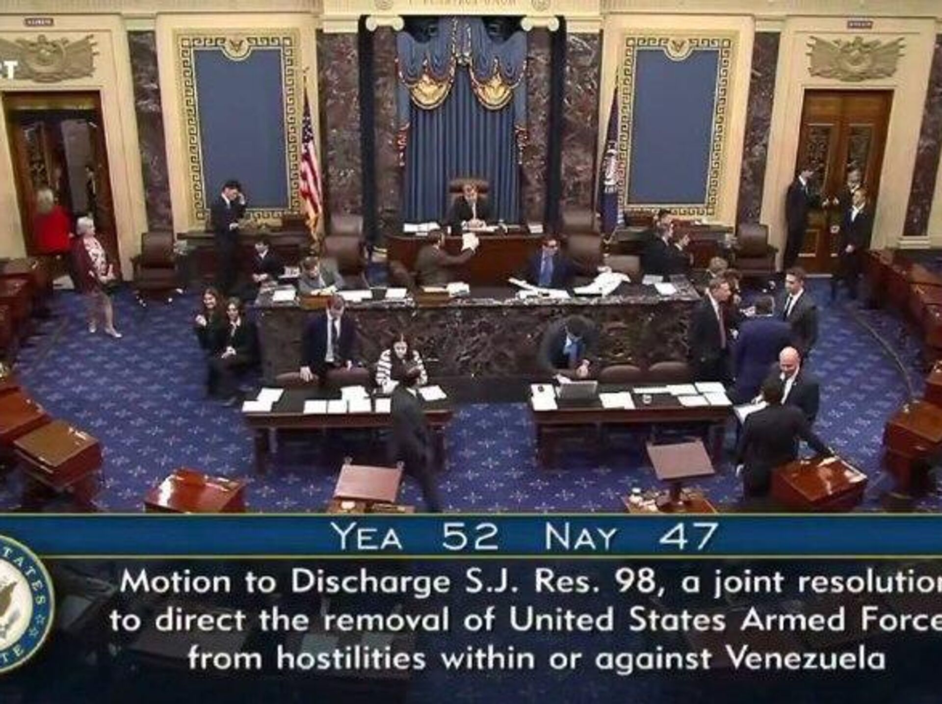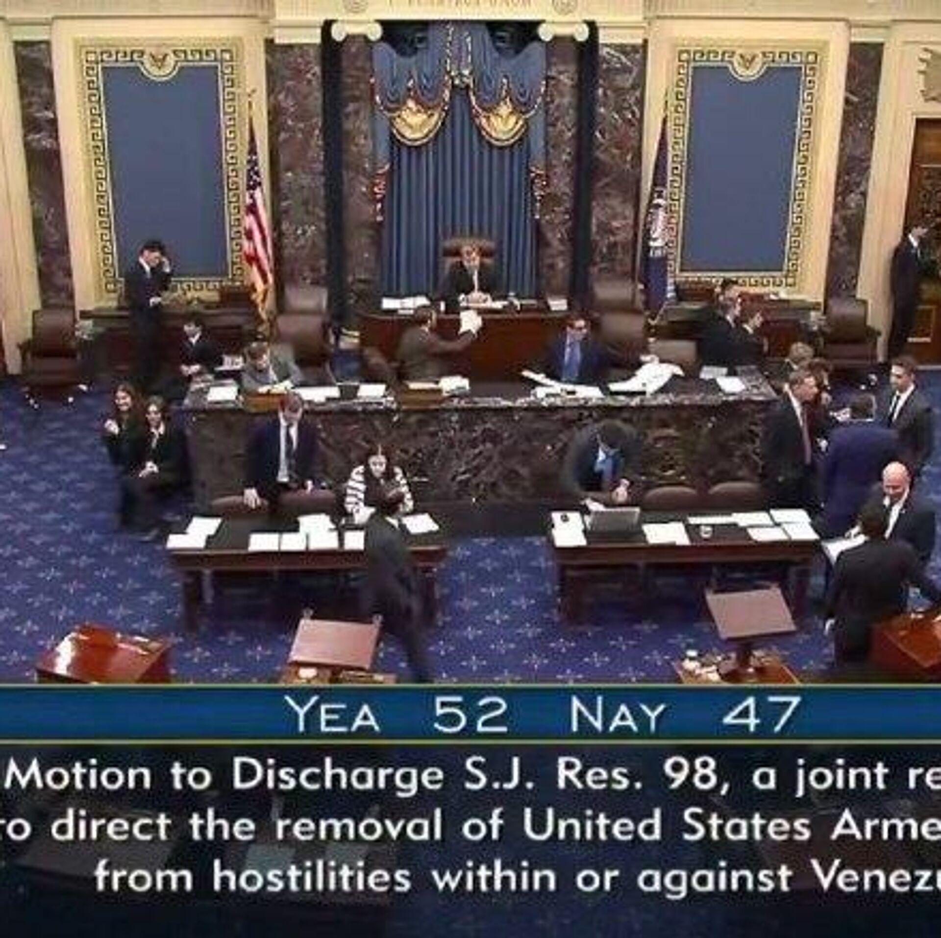◻سنای آمریکا با 52 رأی موافق در برابر 47 رأی مخالف، قطعنامه اختیارات جنگی با هدف محدود کردن استفاده از نیروهای مسلح علیه ونزوئلا را تصویب کرد.