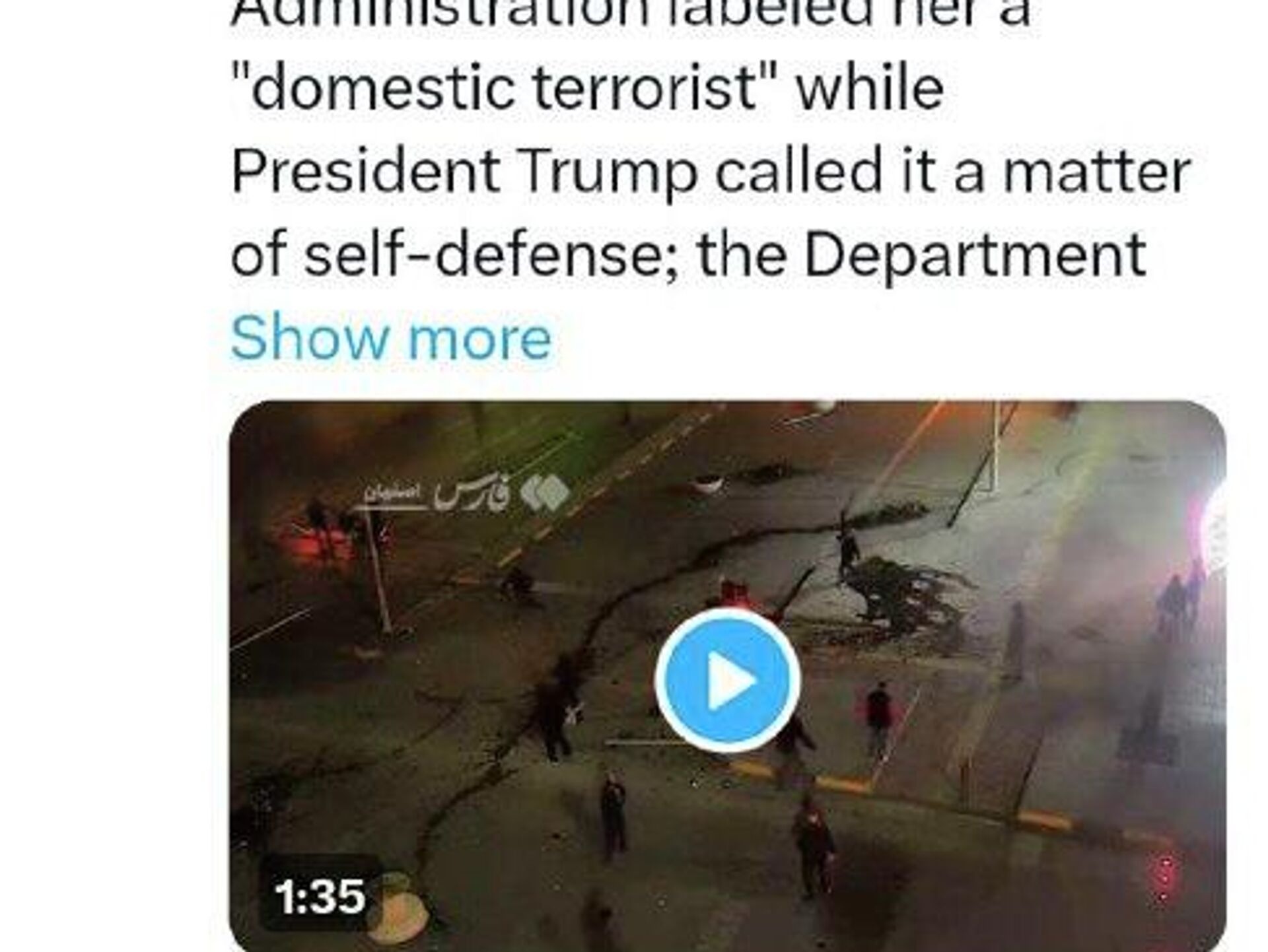 همین چند روز پیش، یک زن جوان بیگناه در ایالات متحده - یک شهروند آمریکایی و مادر سه فرزند - توسط پلیس مهاجرت آن کشور از فاصله بسیار کم به قتل رسید. دولت ایالات متحده آن خانم را "تروریست داخلی" نامید، رئیس جمهور ترامپ قتل او را دفاع پلیس از خود خواند، و وزارت امنیت داخلی آمریکا همه شهروندان آن کشور را تهدید کرد که "اگر دست به یک افسر یا مامور فدرال بزنید، با تمام شدت اعمال قانون خواهید شد."