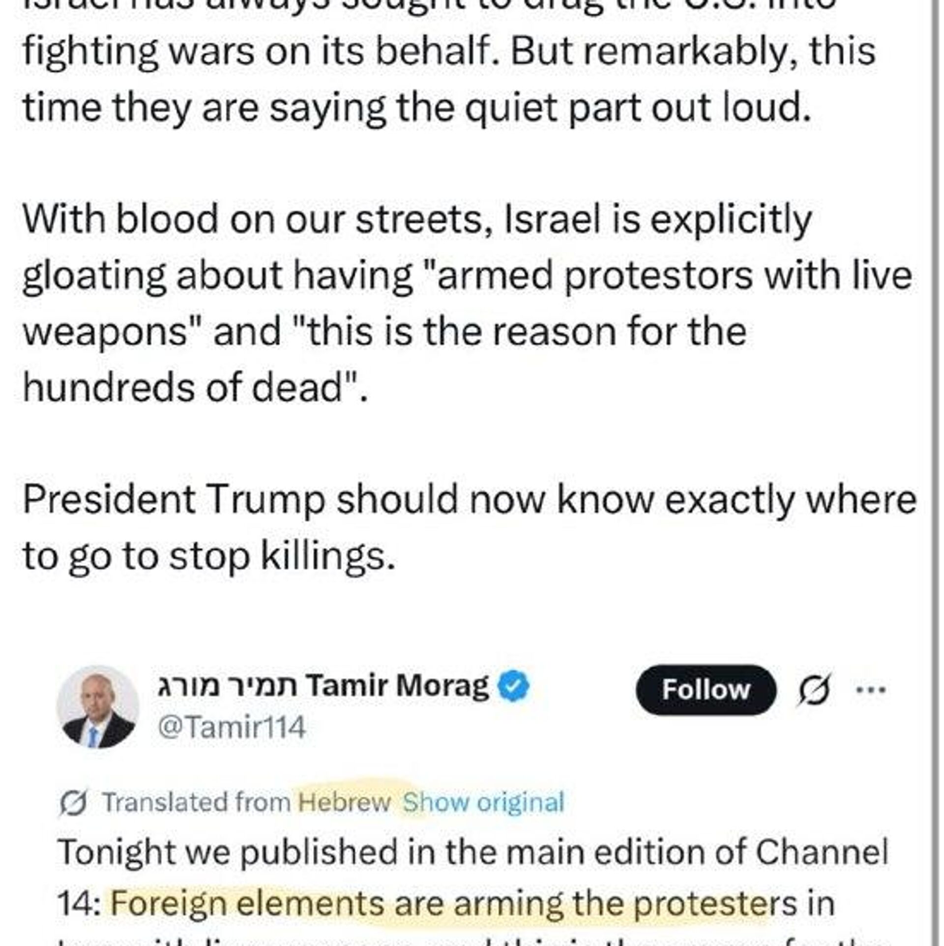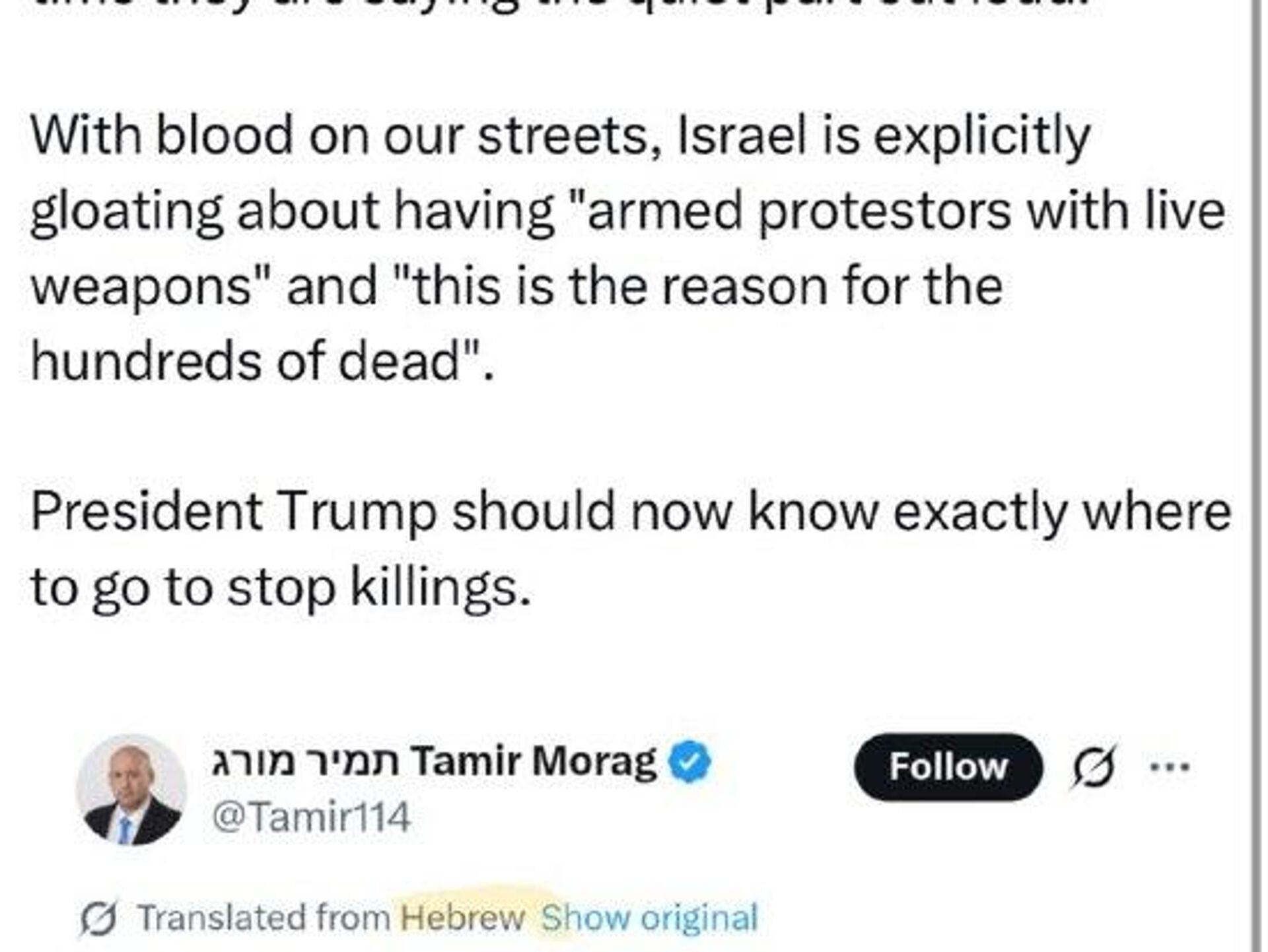 ▫حالا که خیابانهای ما خونآلود شده است، اسرائیل آشکارا با افتخار میگوید که «معترضان را با سلاح جنگی مسلح کرده» و «این دلیل صدها کشته است».