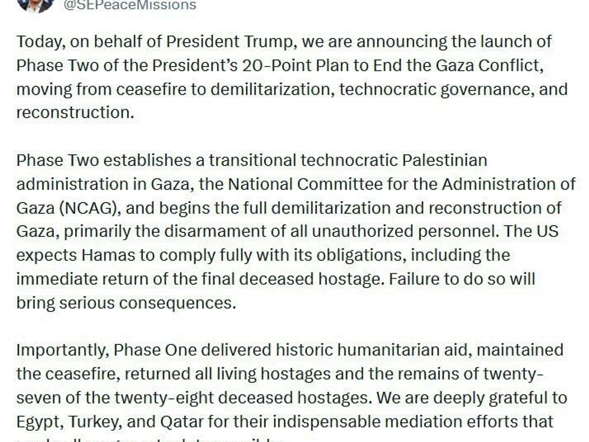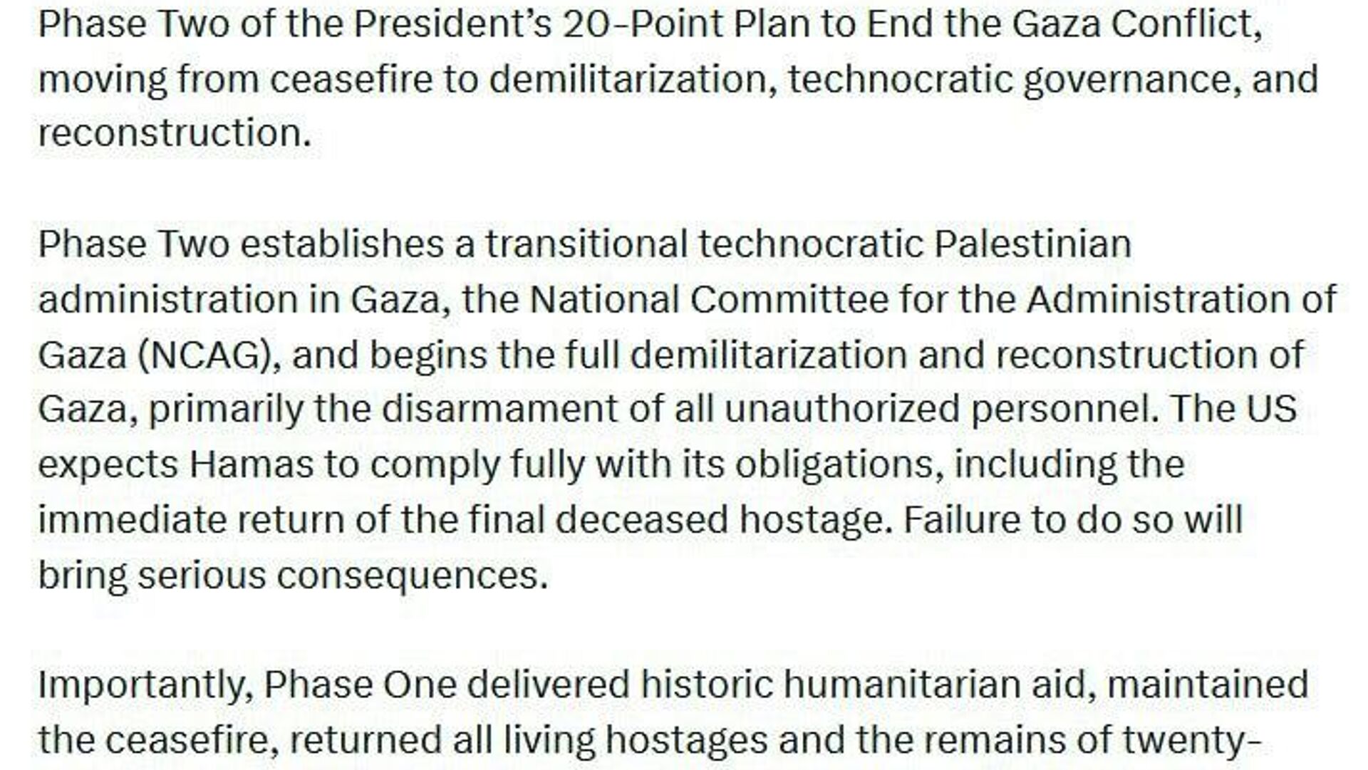 ▫ما از حماس انتظار داریم آخرین گروگان های اسرائیلی را بازگرداند و عدم انجام این کار عواقب جدی را به دنبال خواهد داشت.