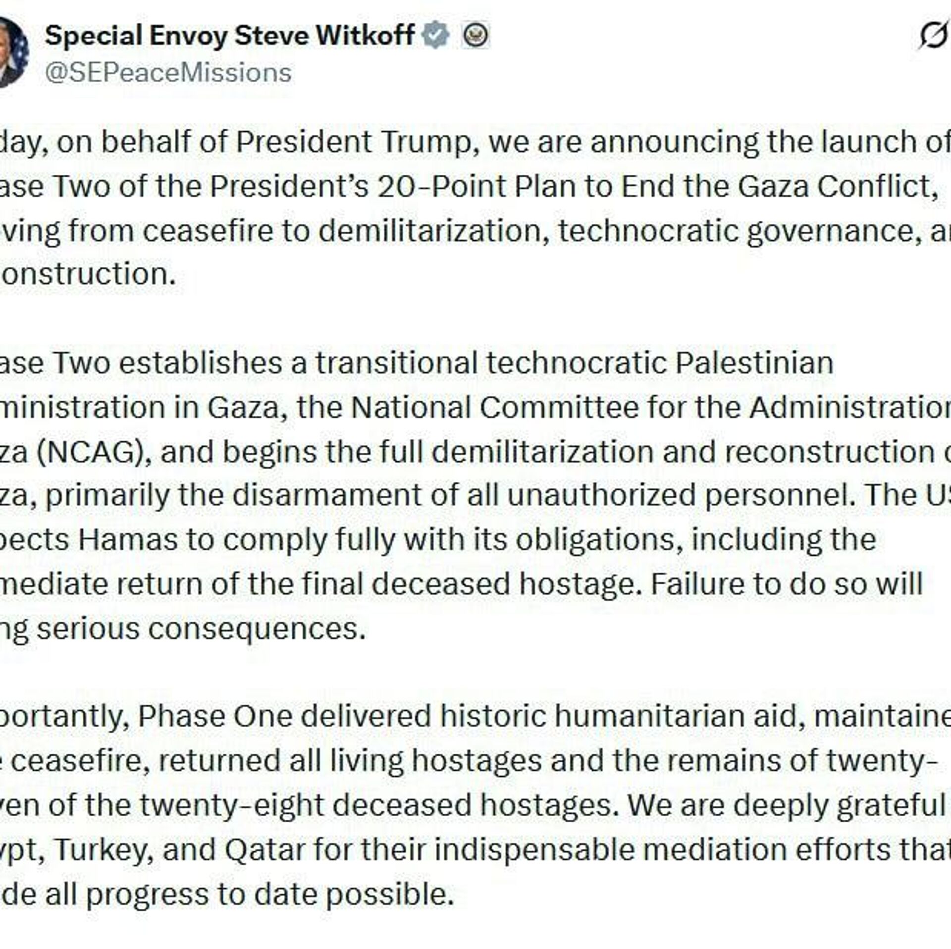 ▫ما گذار از آتشبس در غزه به خلع سلاح، حکومت تکنوکرات ها و بازسازی را اعلام میکنیم.