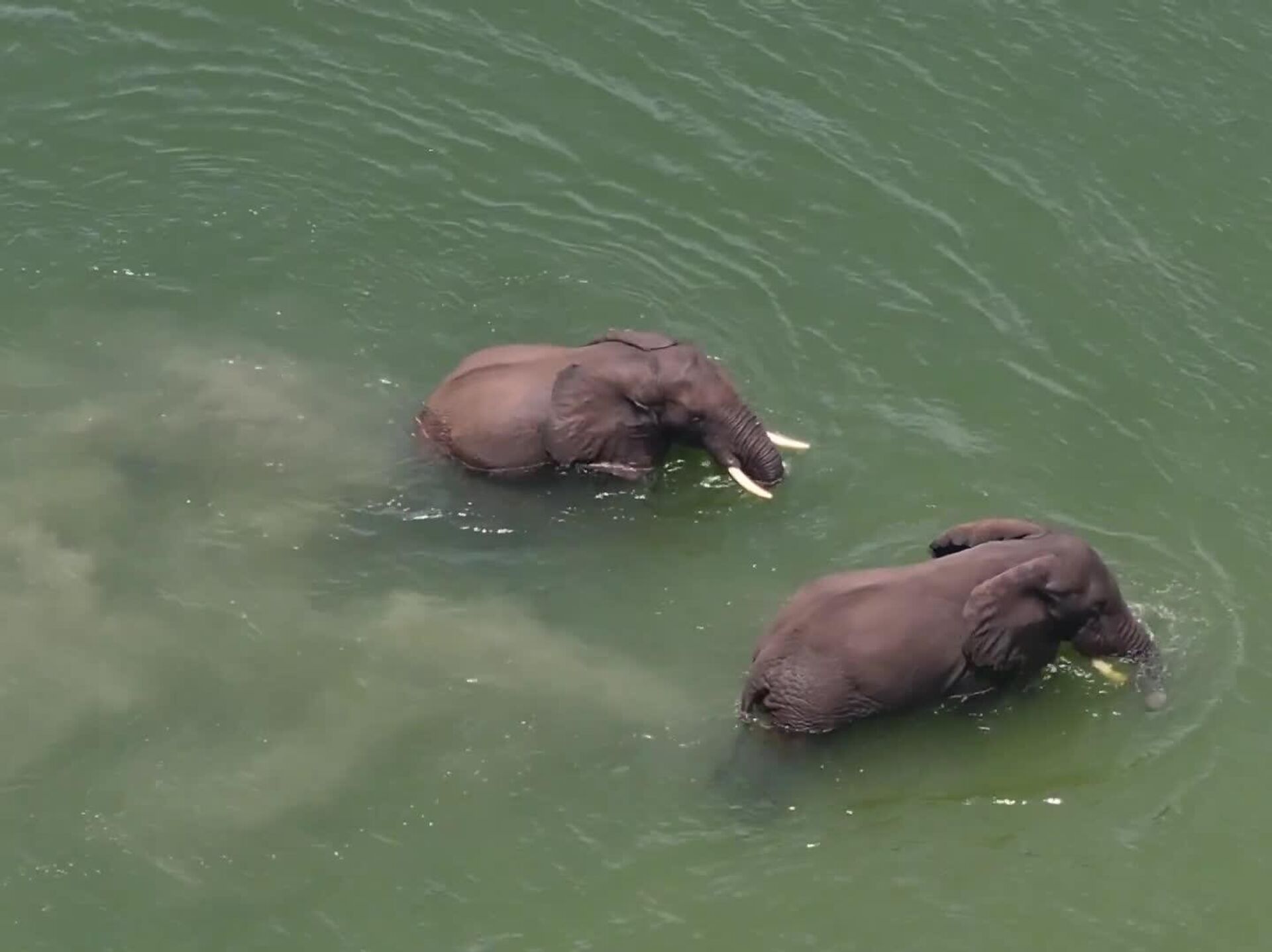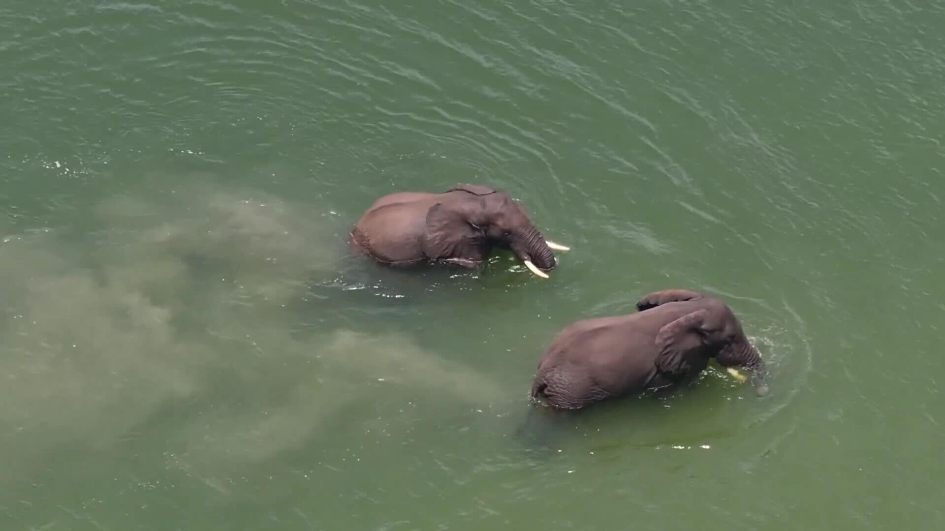 یک پهپاد بر فراز پارک ملی ویرونگا در جمهوری دموکراتیک کنگو، منظرهای نادر و تأثیرگذار را به تصویر کشید: دو فیل در رودخانهای، آببازی میکردند و با بازیگوشی یکدیگر را هل میدادند.