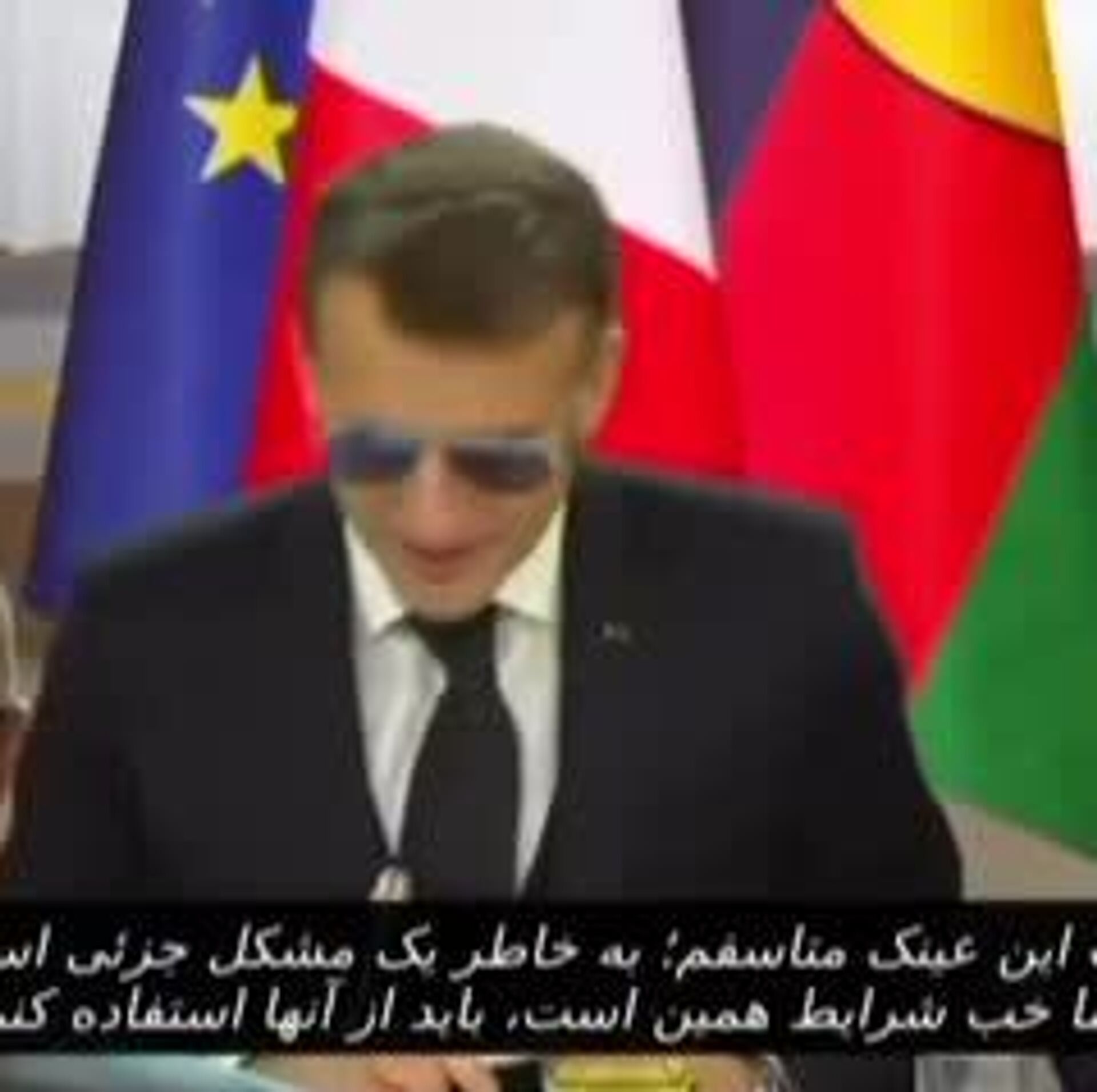 امانوئل مکرون یک روز پس از آنکه با چشم خونآلود در ملاء عام ظاهر شد، اکنون با عینک آفتابی سخنرانی کرد