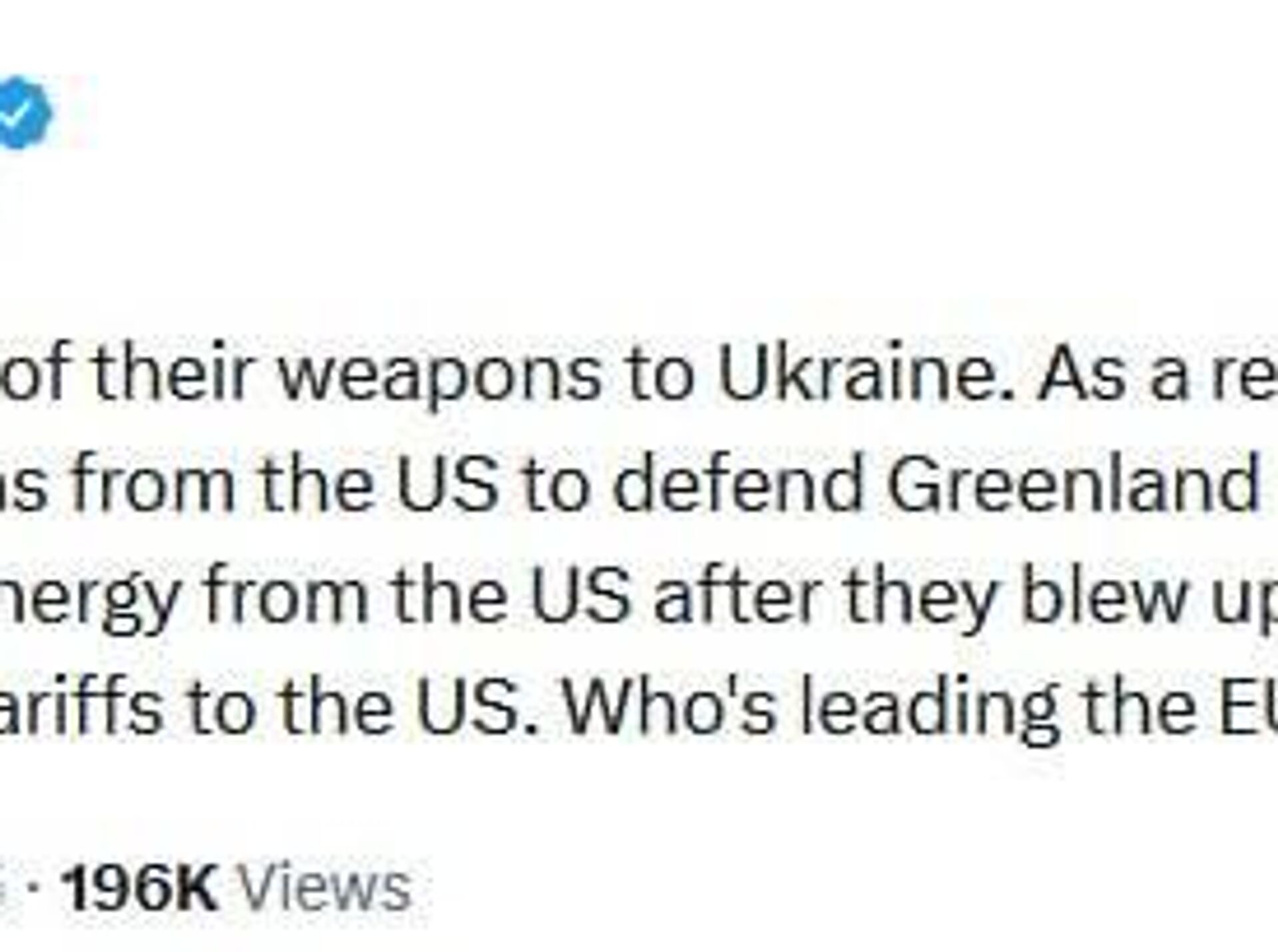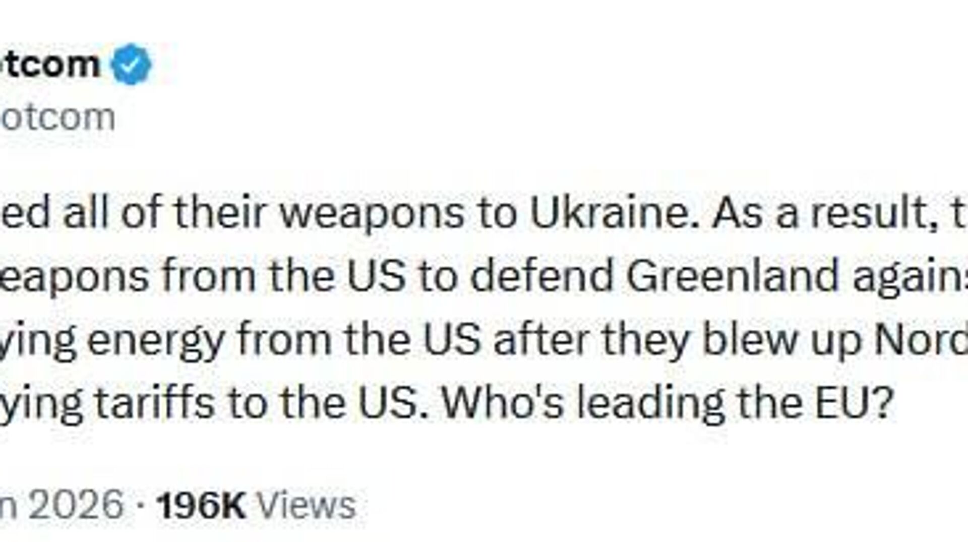 کیم داتکام، تاجر و فعال سیاسی آلمانی، در ایکس مینویسد: اتحادیه اروپا مجبور است به دلیل سیاستهای خود، انرژی و سلاح را از ایالات متحده آمریکا تأمین کند و همچنین به آن تعرفه بپردازد.
