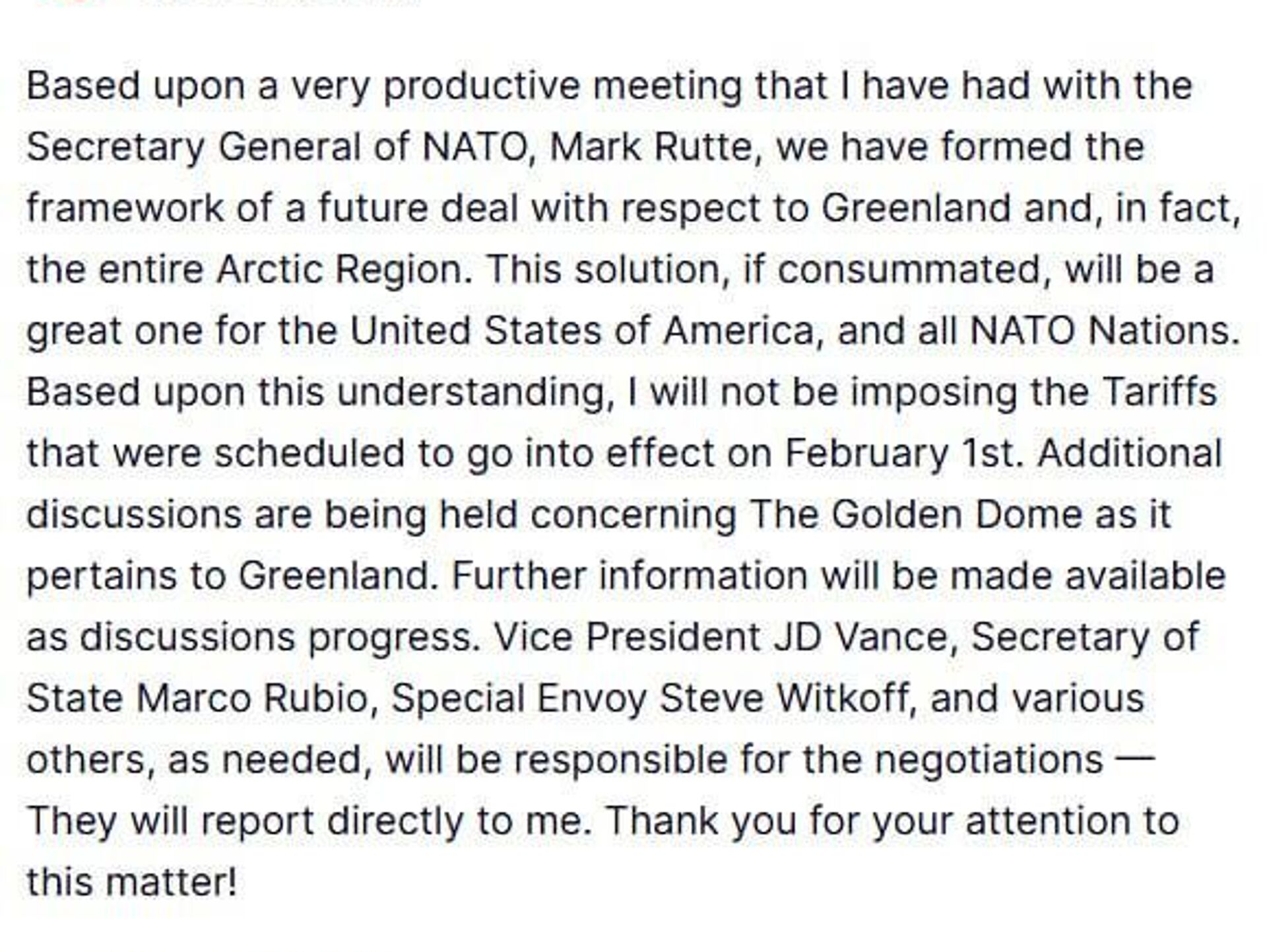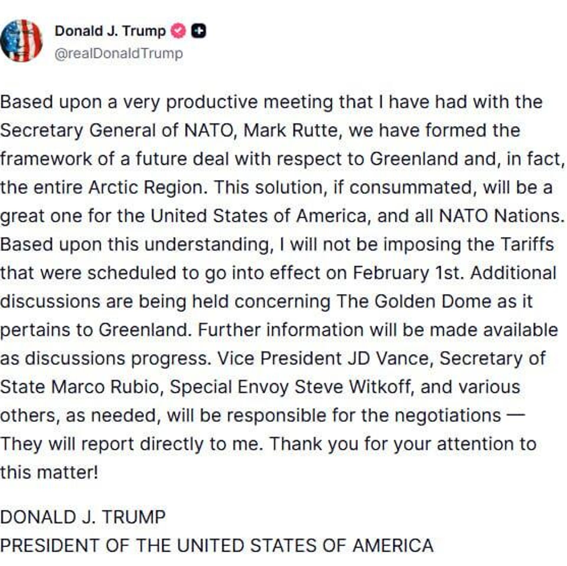 وی افزود: «این راه حل، در صورت تحقق، برای ایالات متحده آمریکا و همه کشورهای عضو ناتو عالی خواهد بود. بر اساس این تفاهم، من تعرفههایی را که قرار بود از اول فوریه به اجرا درآیند، اعمال نخواهم کرد.»