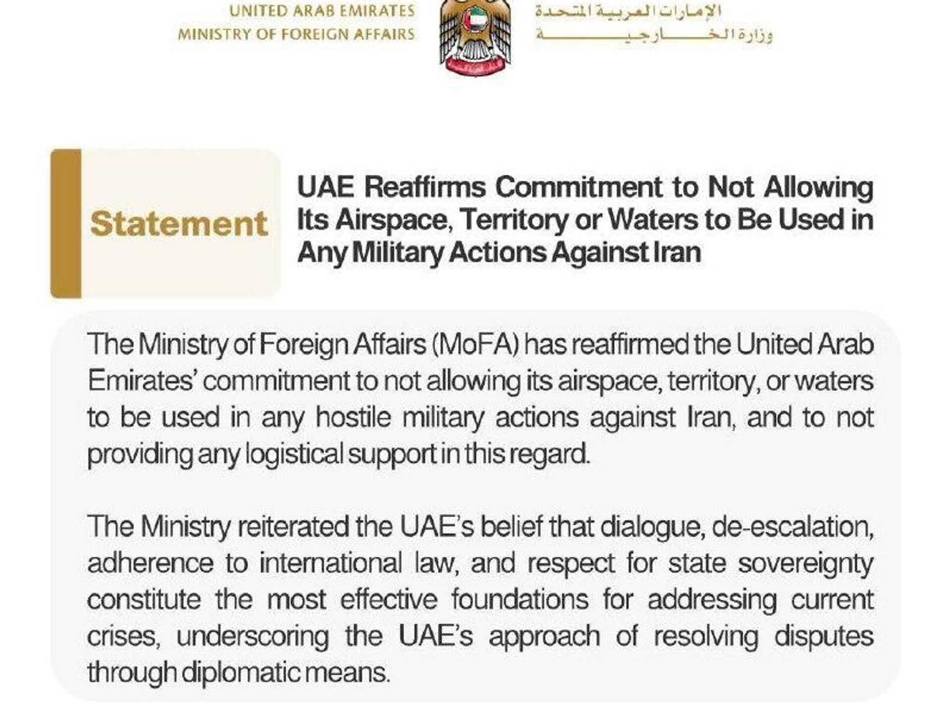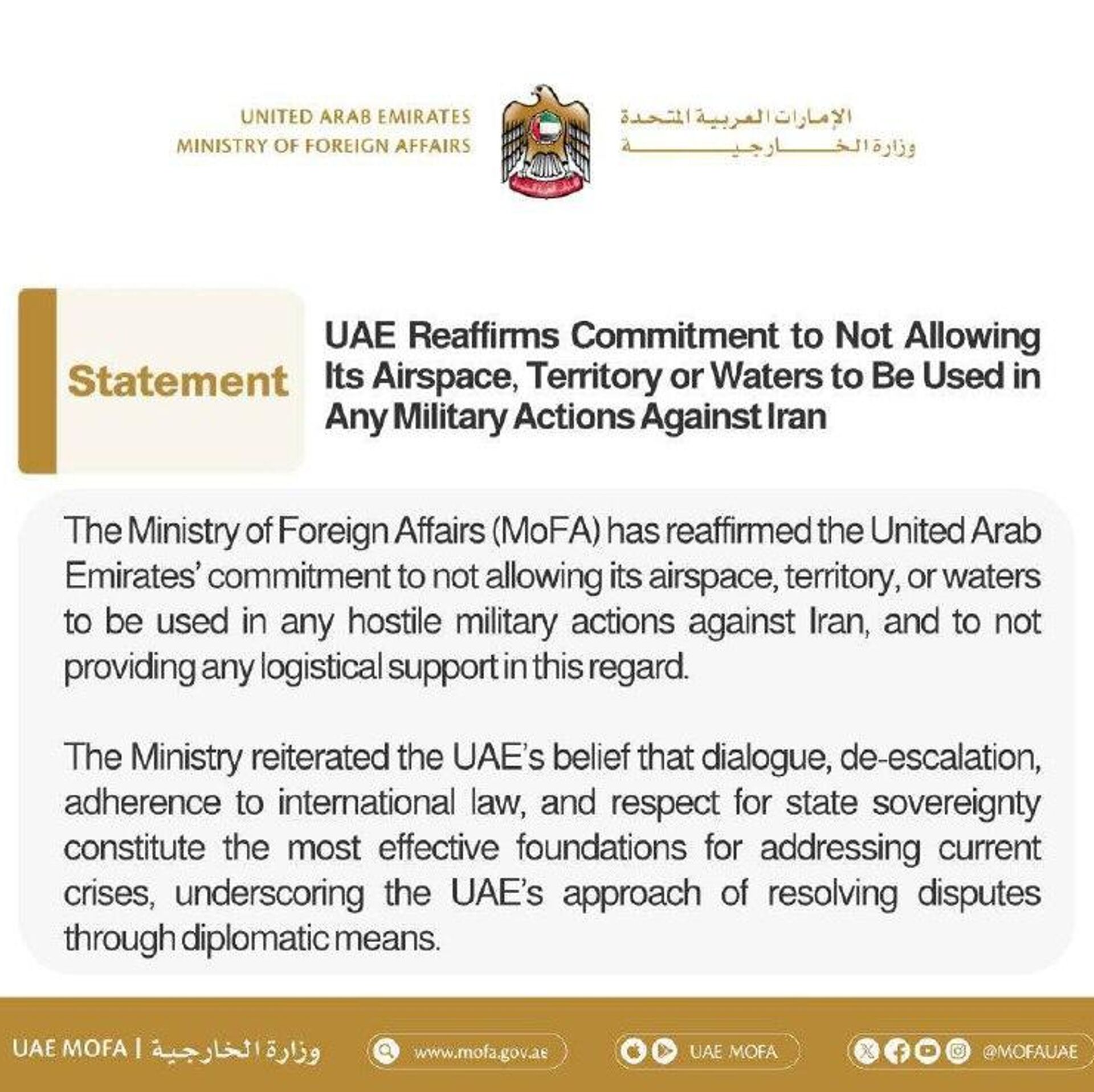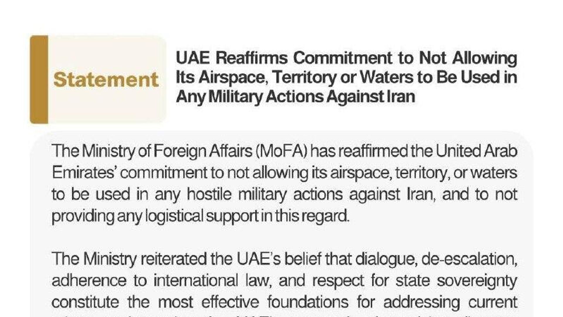 وزارت خارجه امارات متحده عربی اعلام کرد که هرگز اجازه نخواهد داد از حریم هوایی، زمینی و دریایی خود برای انجام عملیات نظامی علیه جمهوری اسلامی ایران استفاده شود.