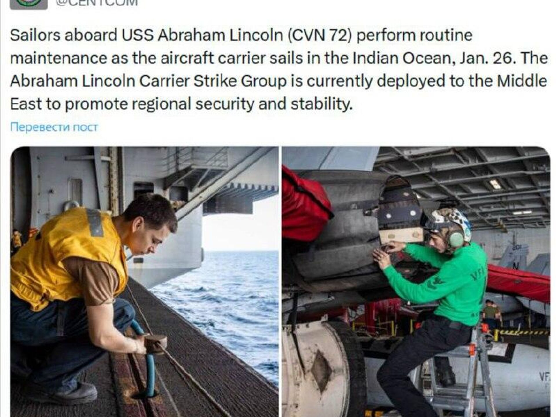 حضور آبراهام لینکلن در خاورمیانه▫فرماندهی مرکزی ایالات متحده اعلام کرد که ناو هواپیمابر آبراهام لینکلن برای «تضمین امنیت و ثبات منطقهای» در خاورمیانه حضور دارد. ما را در سایت و تلگرام اسپوتنیک دنبال کنید Sputnik Iran | Telegram