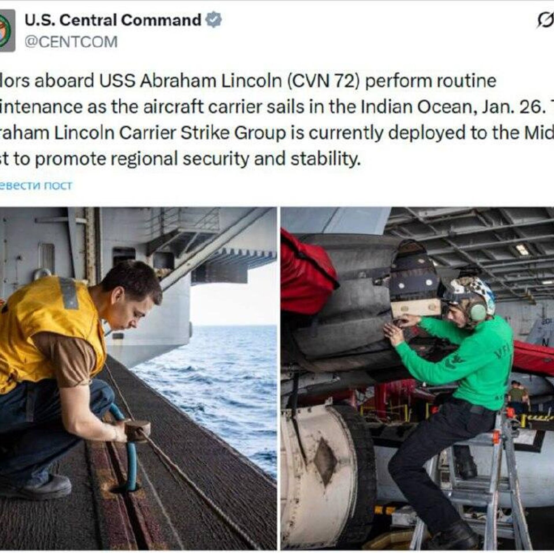 ▫فرماندهی مرکزی ایالات متحده اعلام کرد که ناو هواپیمابر آبراهام لینکلن برای «تضمین امنیت و ثبات منطقهای» در خاورمیانه حضور دارد.
