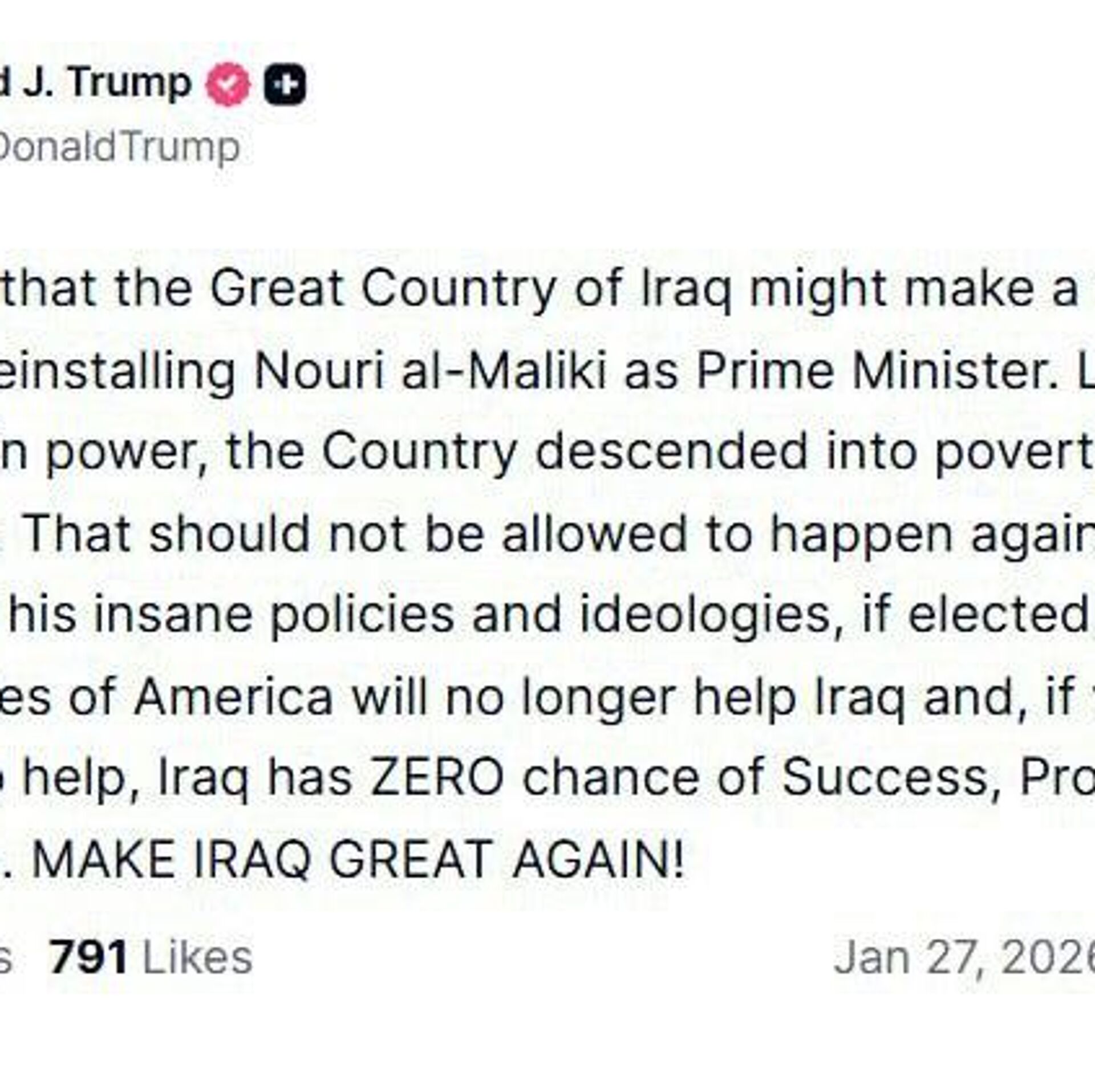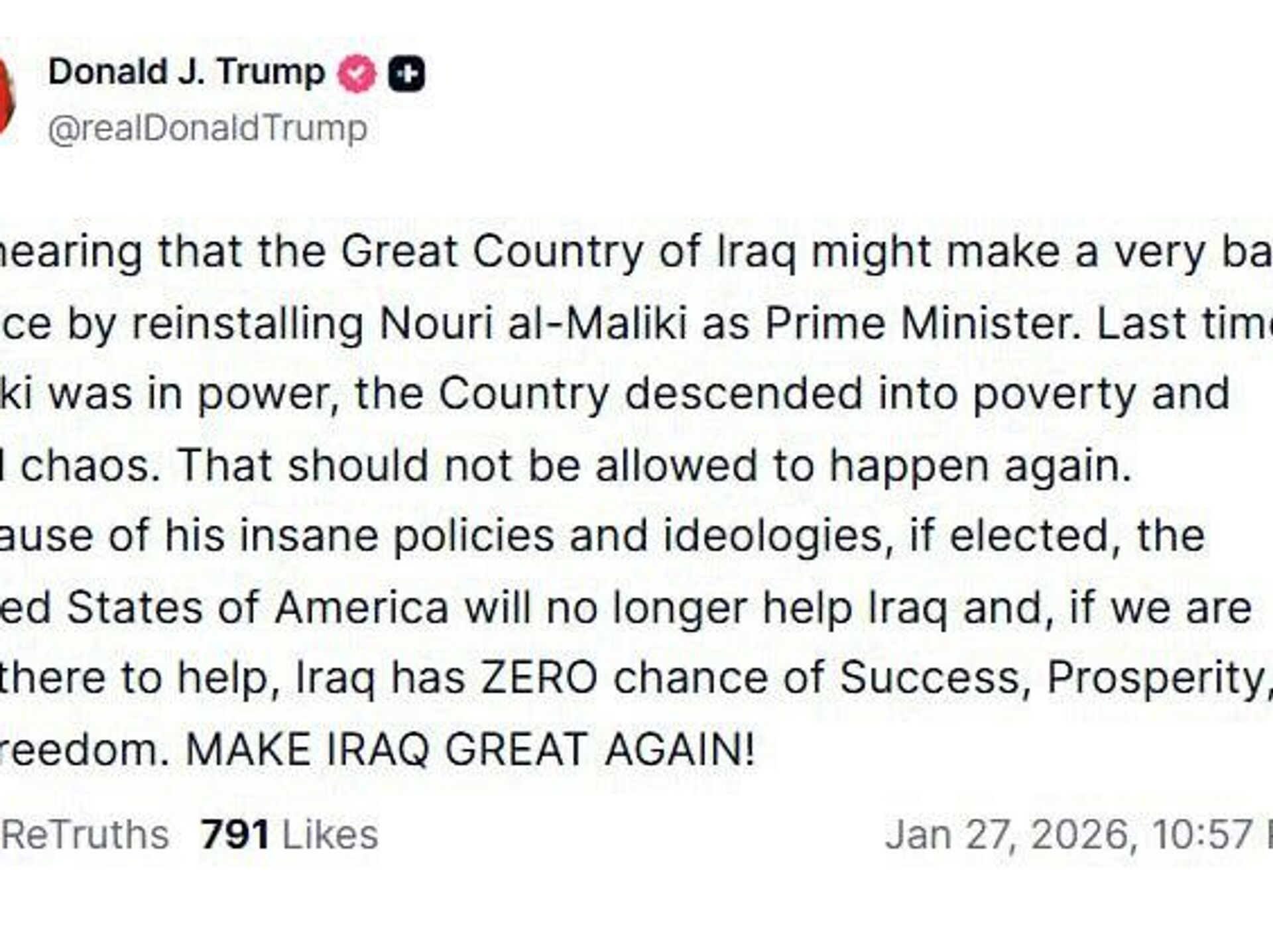 ترامپ در وبسایت Truth Social نوشت: «در صورت انتخاب، ایالات متحده آمریکا دیگر به عراق کمک نخواهد کرد.»