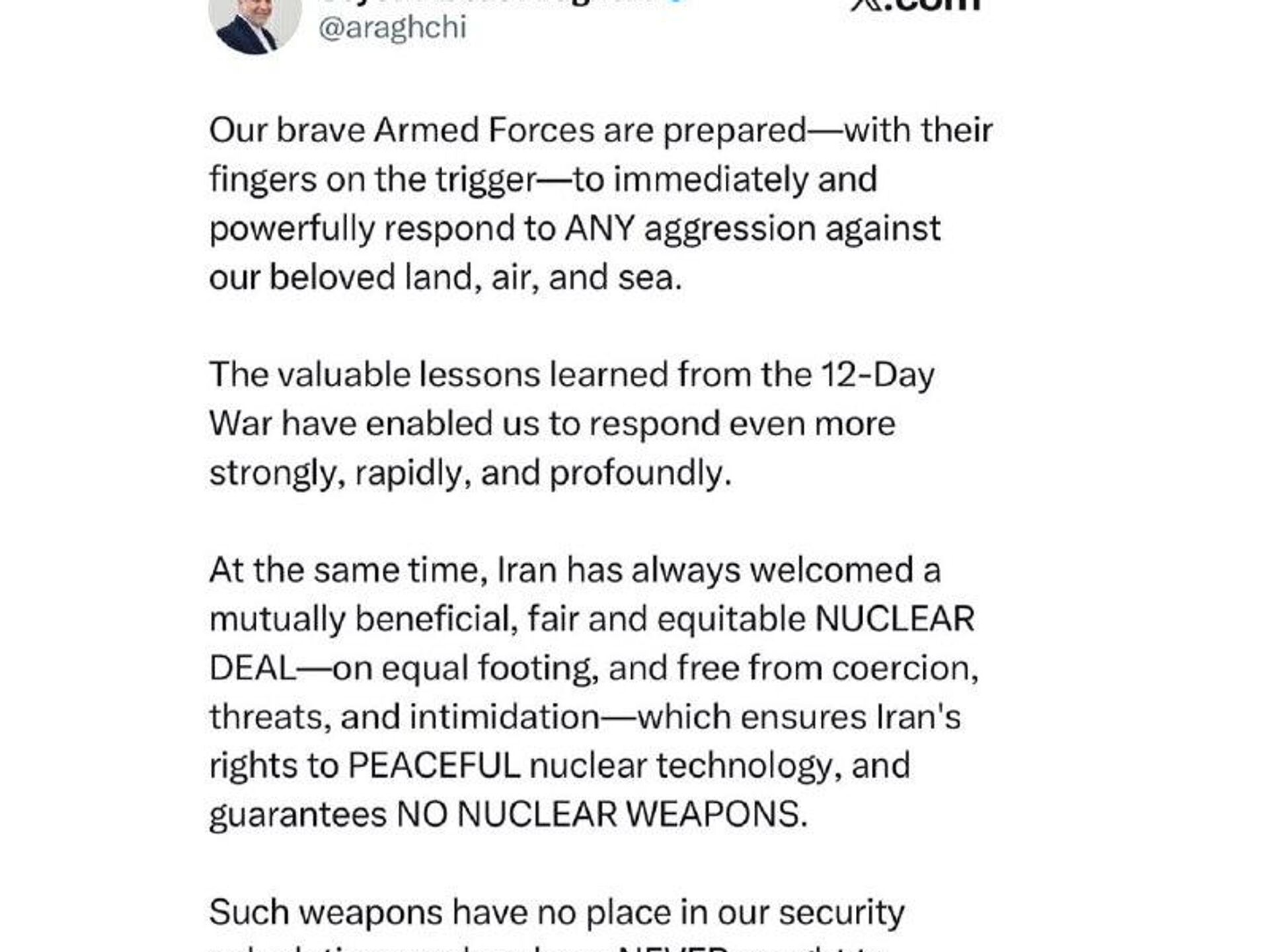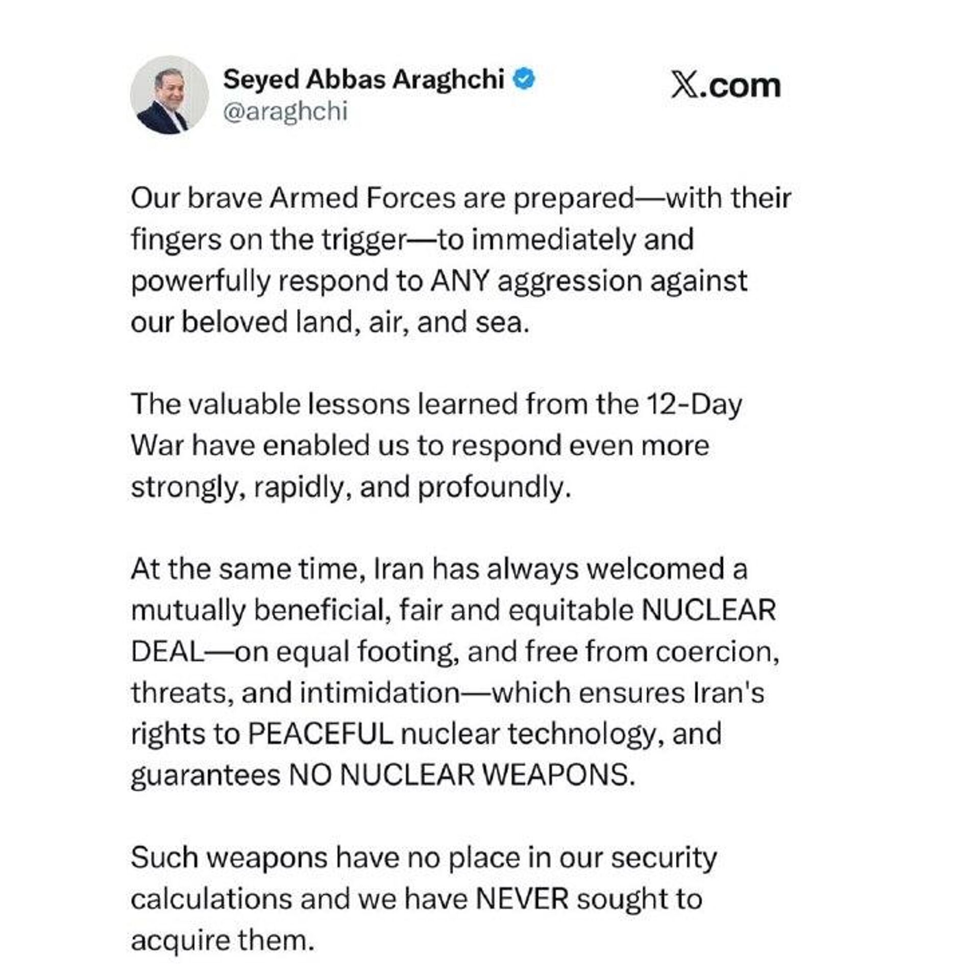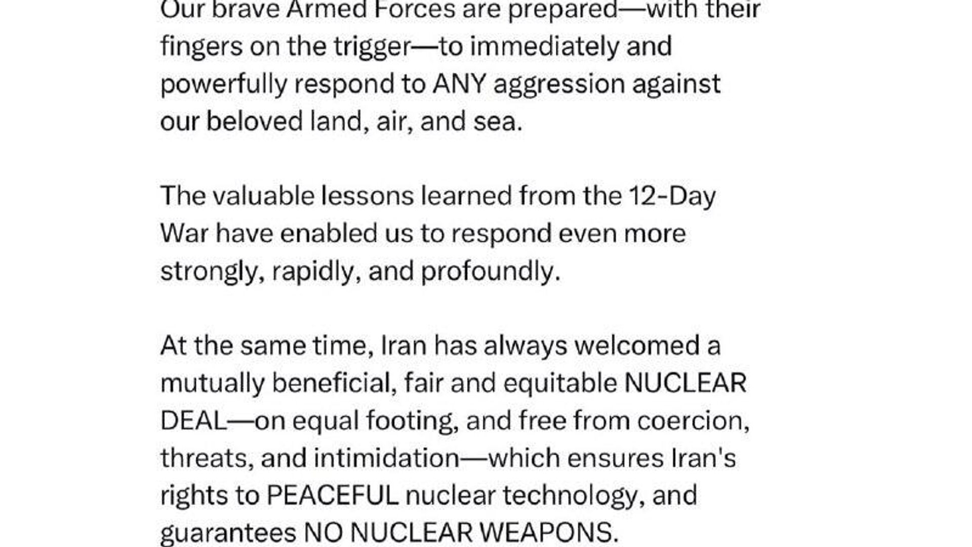 نیروهای مسلح شجاع ما با آمادگی کامل، و انگشت بر ماشه، آمادهاند تا بهطور سریع و قاطع به هرگونه تجاوز علیه خاک، حریم هوایی و آبهای سرزمینی کشور عزیزمان پاسخ دهند.درسهای ارزشمند آموختهشده از جنگ 12روزه این توان را به ما داده است که اکنون با قدرت، سرعت و شدت بیشتری واکنش نشان دهیم.