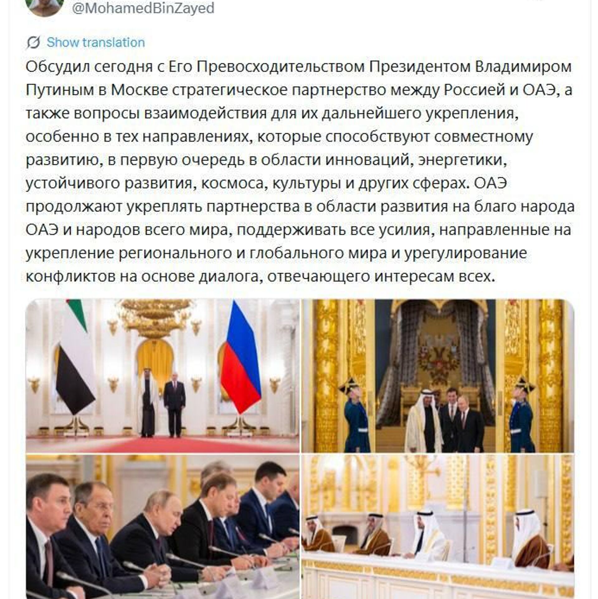 توییت رئیس امارات به زبان روسی درباره دیدار با پوتین در مسکو