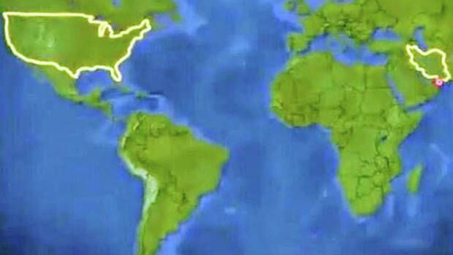 چندین اقیانوس آنسوتر، در طرف دیگر کرهٔ زمین، مرزهای ایران نیز با رنگ زرد مشخص شدهاند. دایرهٔ کوچک قرمز، تنگهٔ هرمز را نشان میدهد.