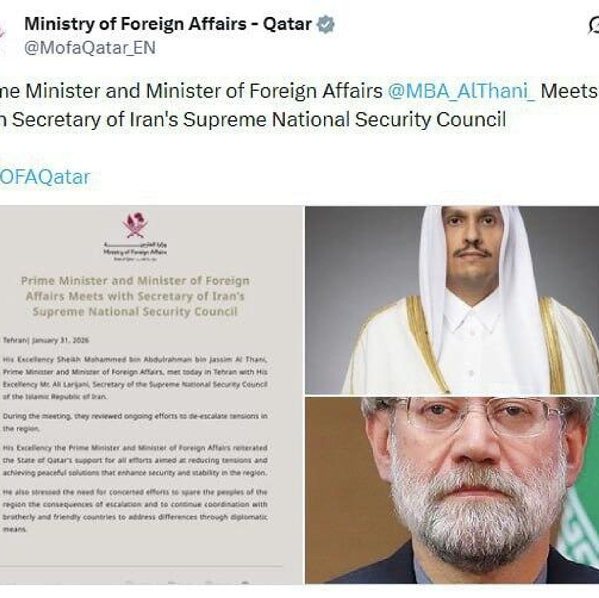 وزارت امور خارجه قطر اعلام کرد که شیخ محمد بن عبدالرحمن آل ثانی، نخست وزیر قطر، با علی لاریجانی، رئیس شورای امنیت ملی ایران، در تهران دیدار کرد تا بر کاهش تنشها در منطقه تمرکز کنند.