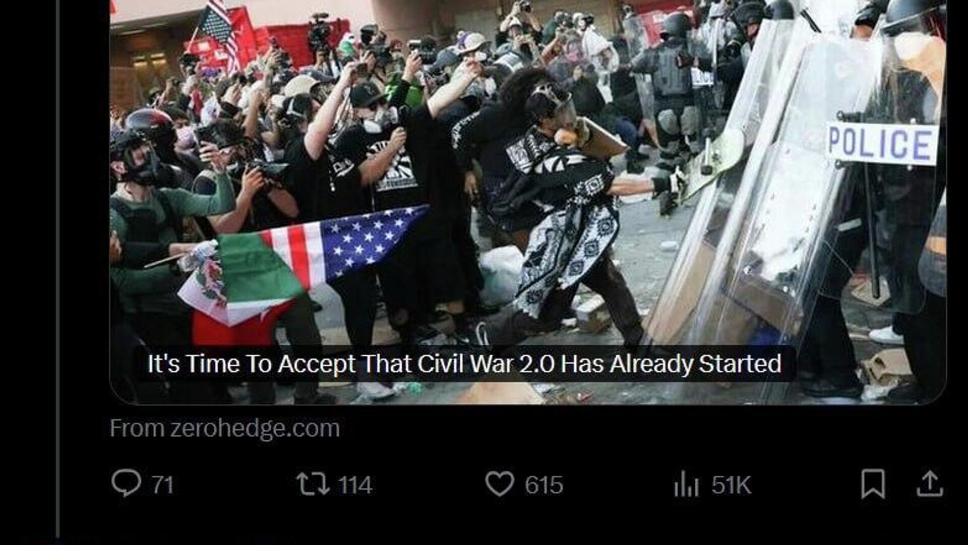 او این نظر را در کامنتی در شبکه اجتماعی ایکس بیان کرد، که نویسنده آن ادعا میکند رویارویی بین دولت فعلی و نیروهای لیبرال، از جمله در جریان اعتراضات در مینیاپولیس، آغاز «جنگ داخلی 2.0» است.