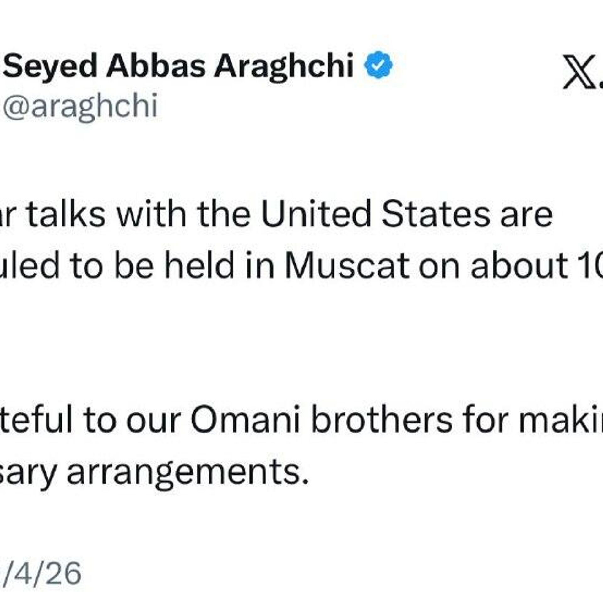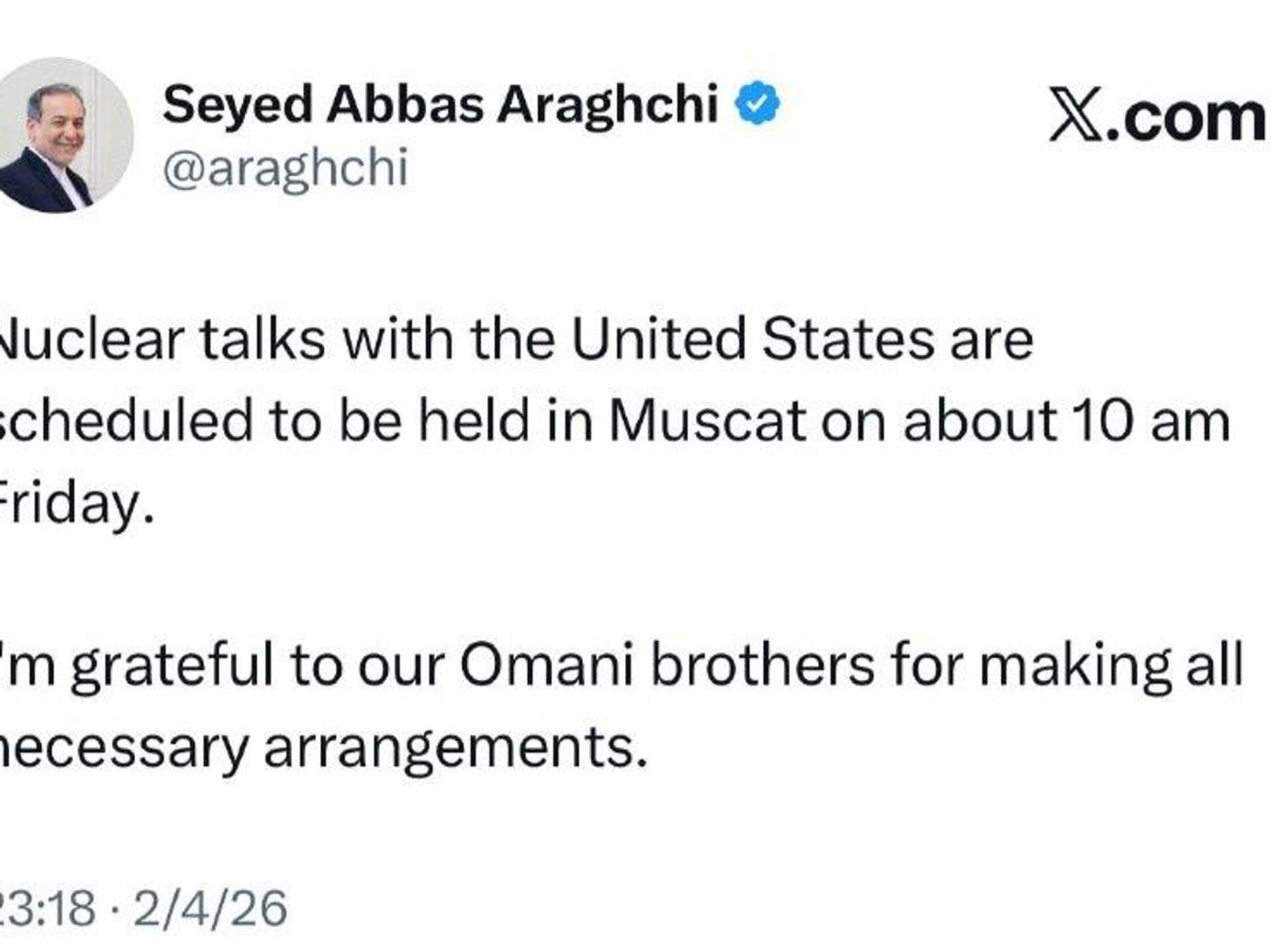 پیام سید عباس عراقچی وزیر خارجه ایران در شبکه ایکس: مذاکرات روز جمعه در مسقط برگزار می شود