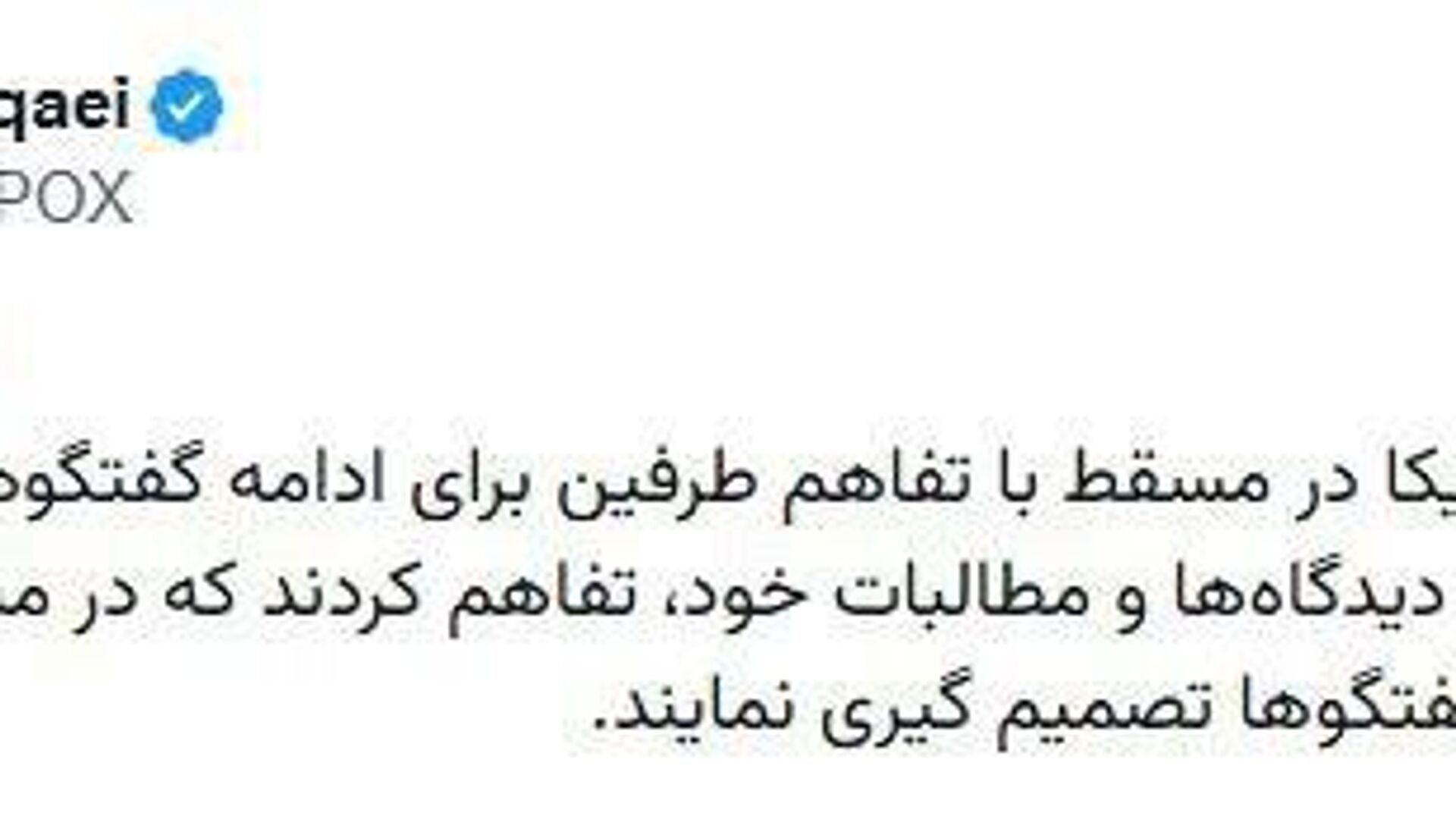 اسماعیل بقائی، سخنگوی وزارت امور خارجه ایران در ایکس نوشت: طرفین ضمن تبیین دیدگاهها و مطالبات خود، تفاهم کردند که در مشورت با پایتختها راجع به دور بعدی گفتگوها تصمیمگیری نمایند.