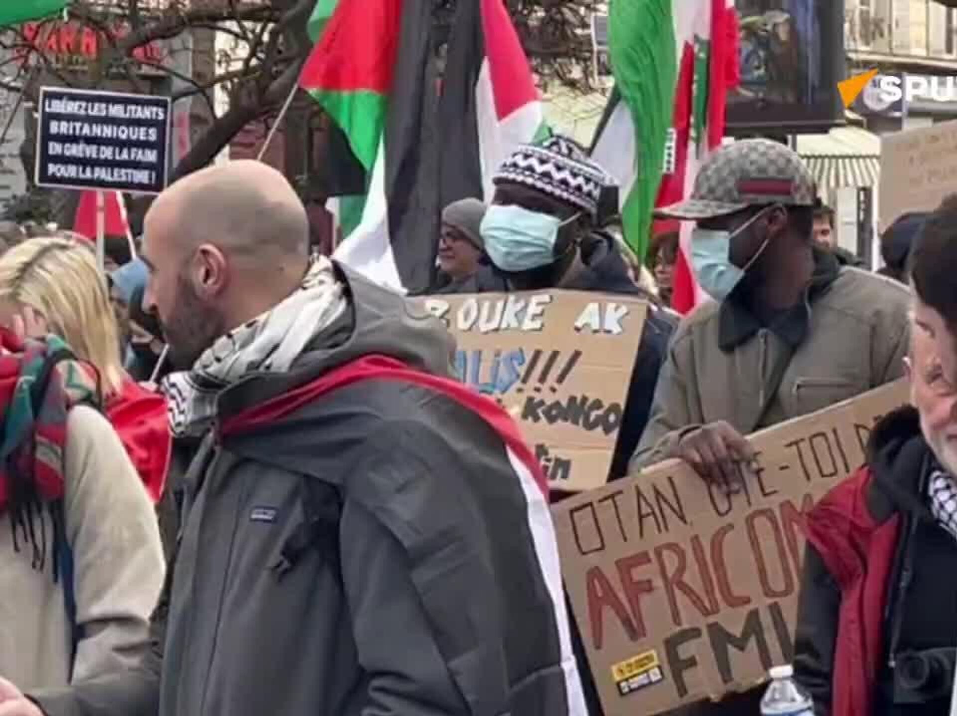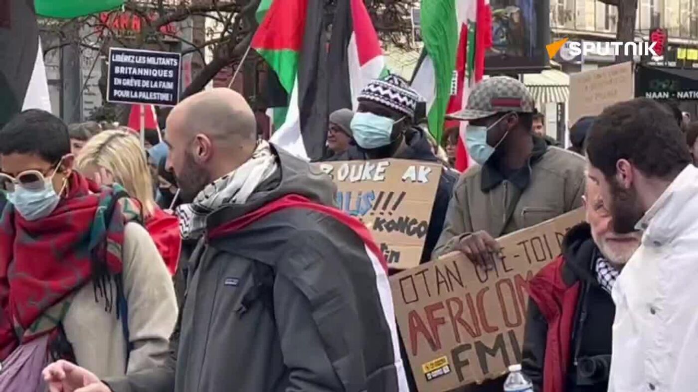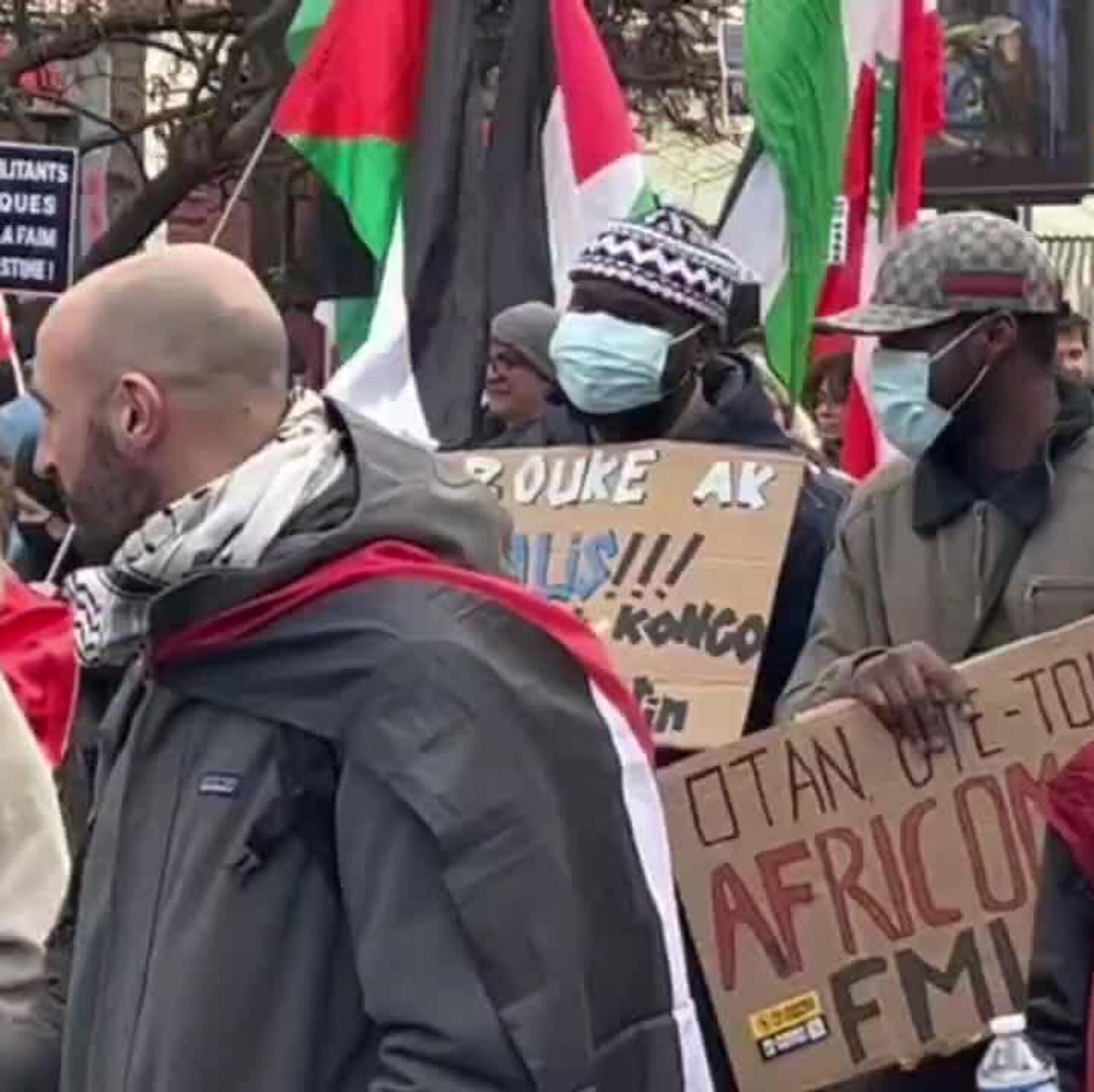 برگزاری تجمعی در دفاع از مردم مظلوم در پاریس با شعارهای «ناتو، از آفریقا برو بیرون!»، «فلسطین آزاد!»، «هائیتی مستقل!»