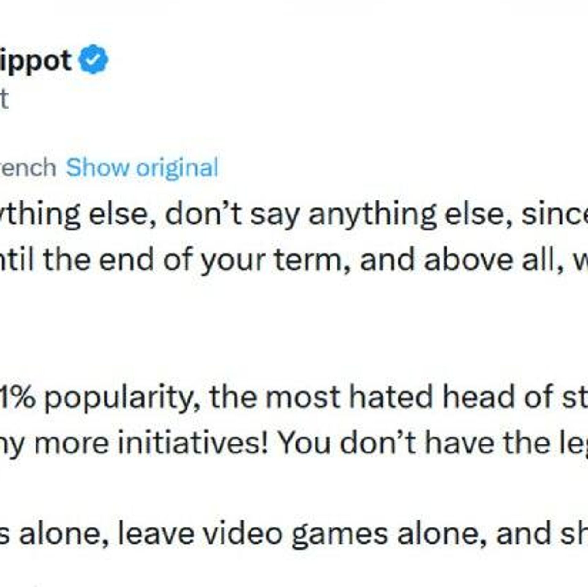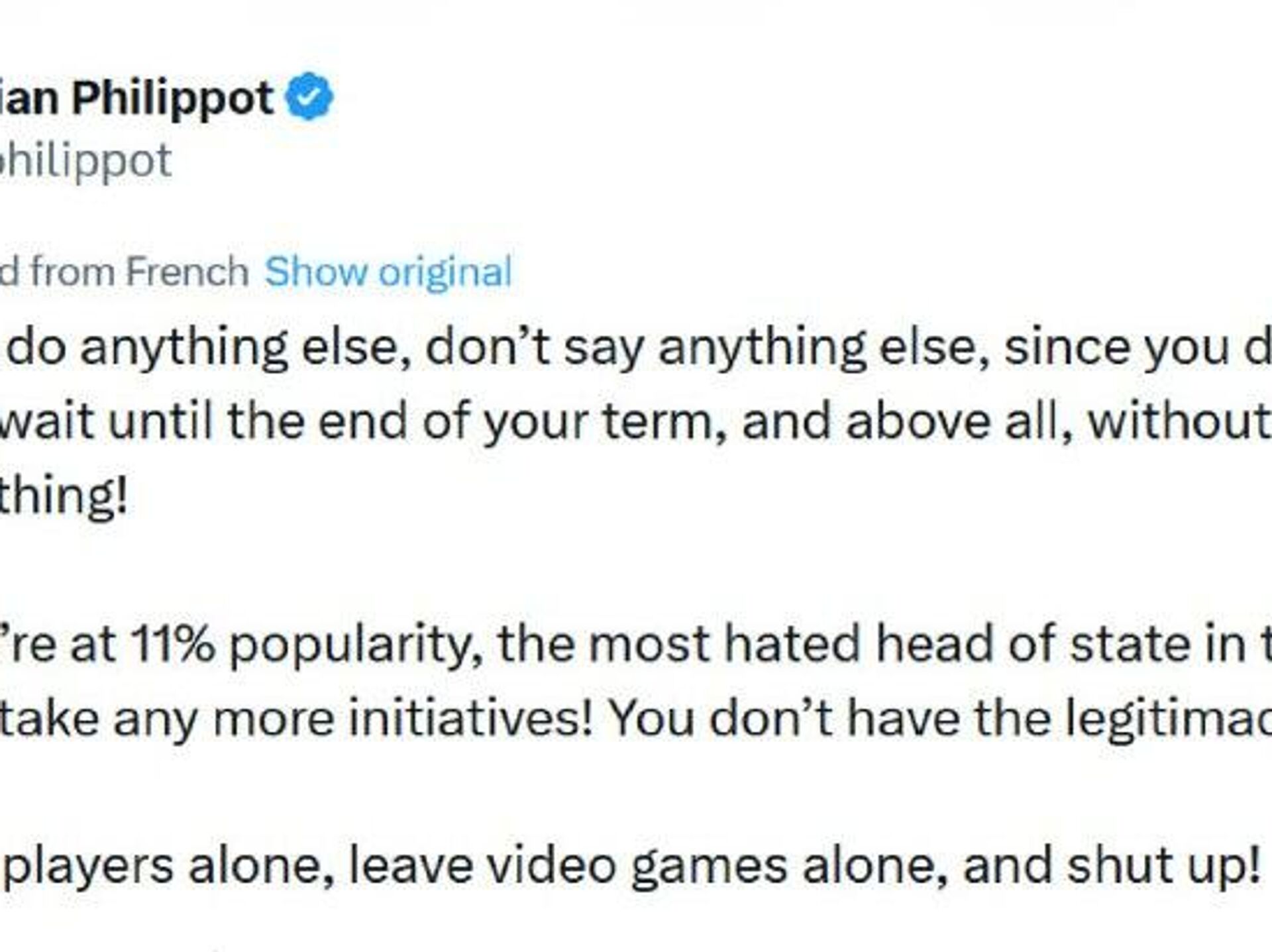 فیلیپوت افزود «وقتی 11٪ محبوبیت داری و منفورترین رئیس دولت جهان هستی، دیگر هیچ ابتکاری به خرج نمیدهی! مشروعیت نداری! بازیکنان را به حال خود رها کن، بازیهای ویدیویی را به حال خود رها کن و خفه شو!».