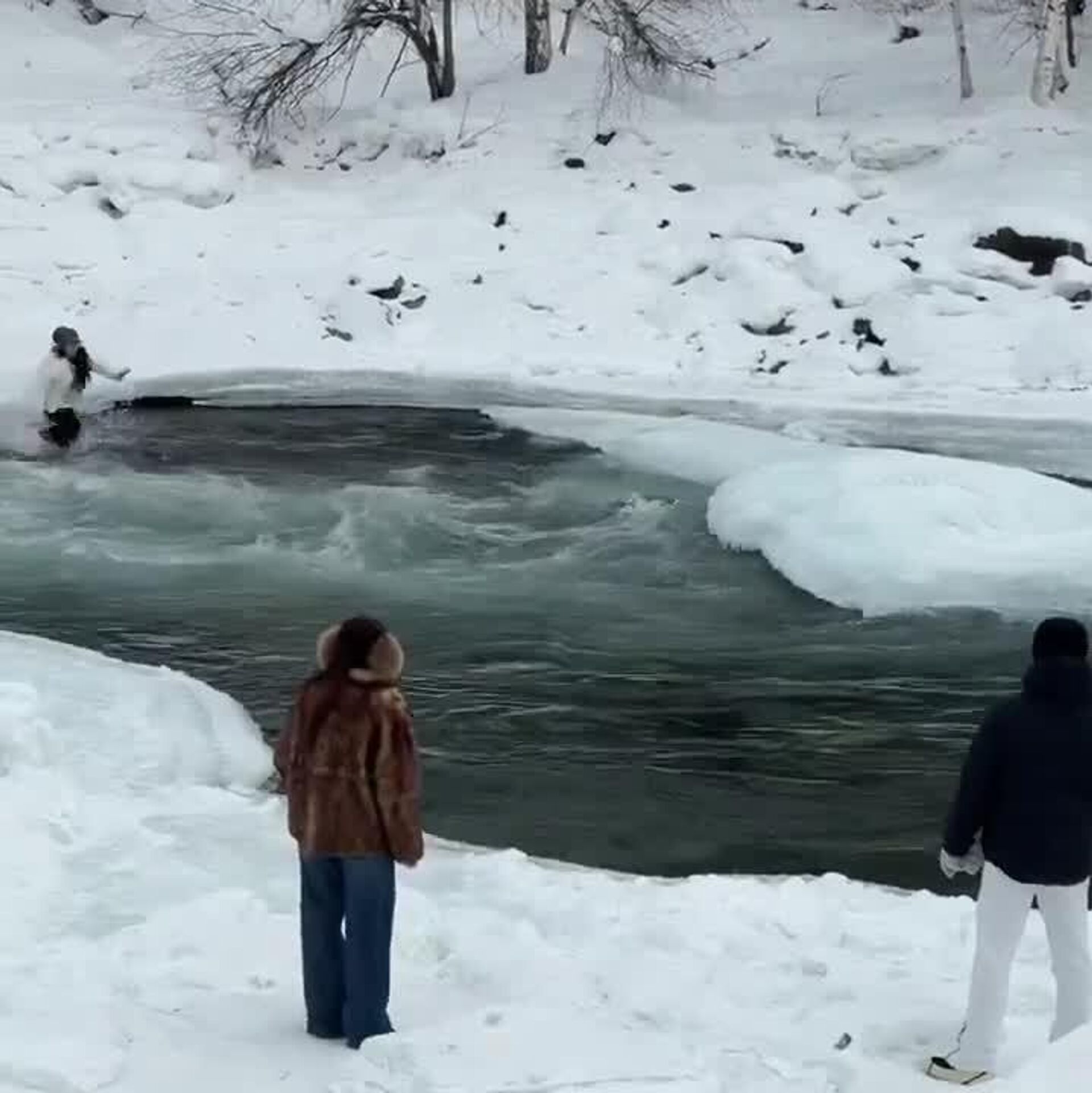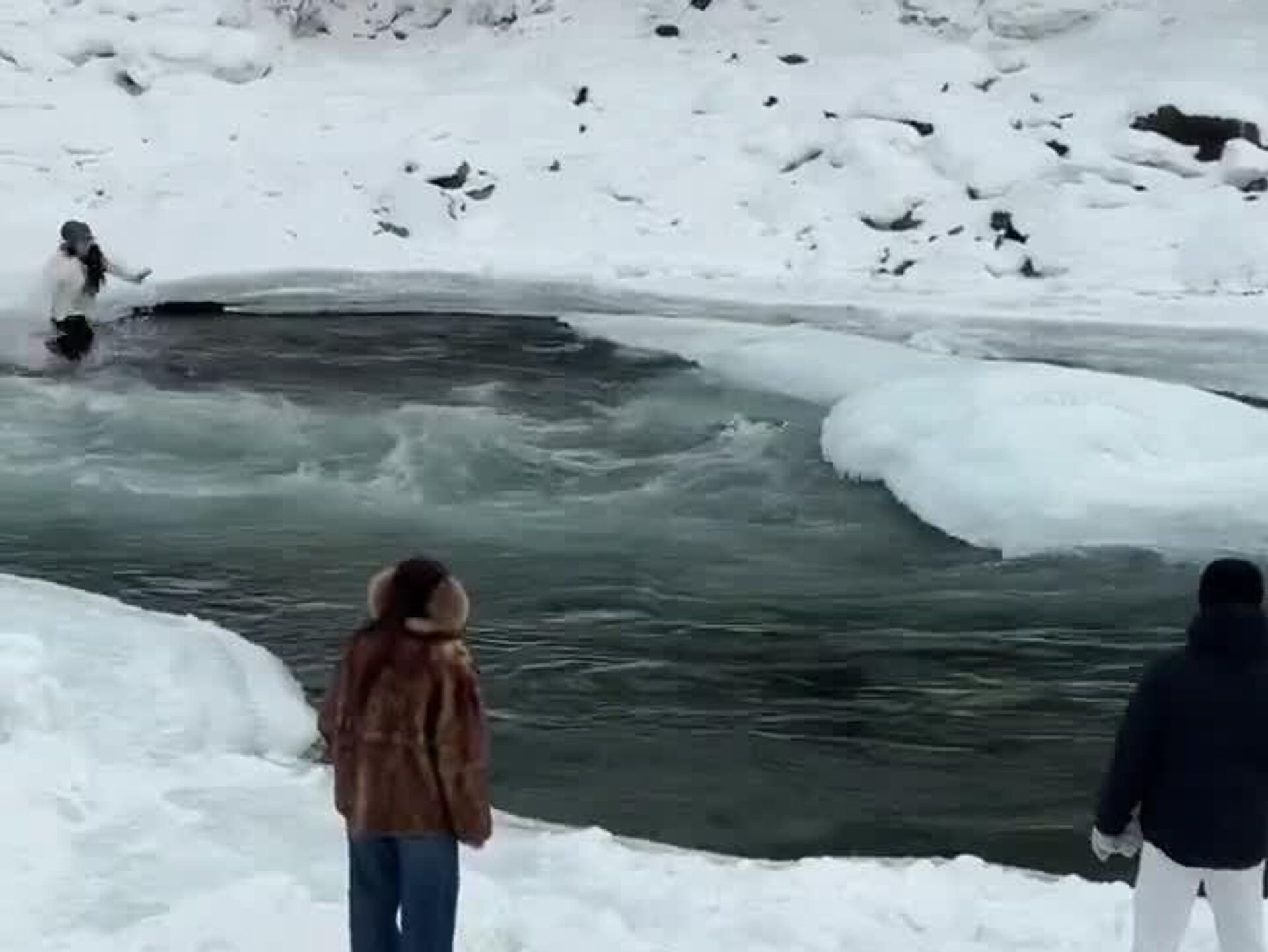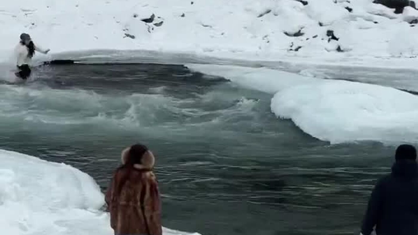 دیروز 10 فوریه، در پارک ملی کاناس (سینکیانگ)، چین، دختری به درون رودخانهای یخ بسته با جریان شدید آب افتاد و مادرش به کمکش شتافت. هر دو تقریباً در حال غرق شدن بودند اما گردشگران موفق به نجات آنها شدند.