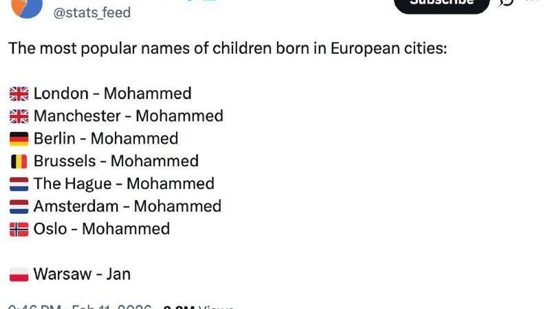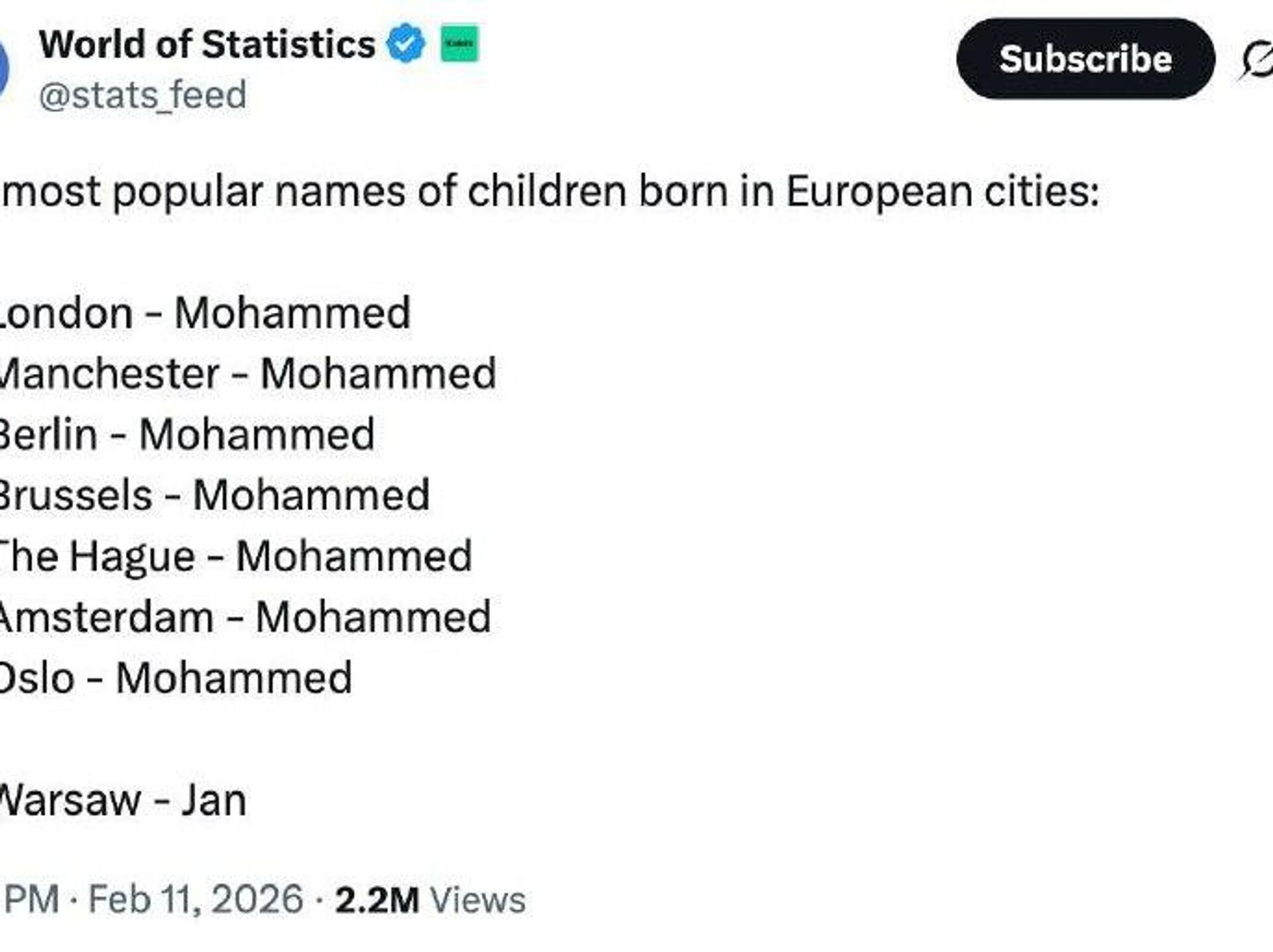 15:00 12.02.2026 (بروز رسانی شده: 15:10 12.02.2026) طبق گزارش پورتال جهانی آمار، محمد به محبوبترین نام در بین نوزادان در چندین شهر اروپایی تبدیل شده است