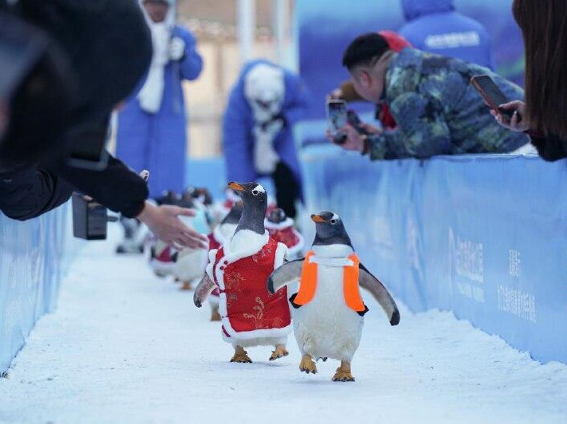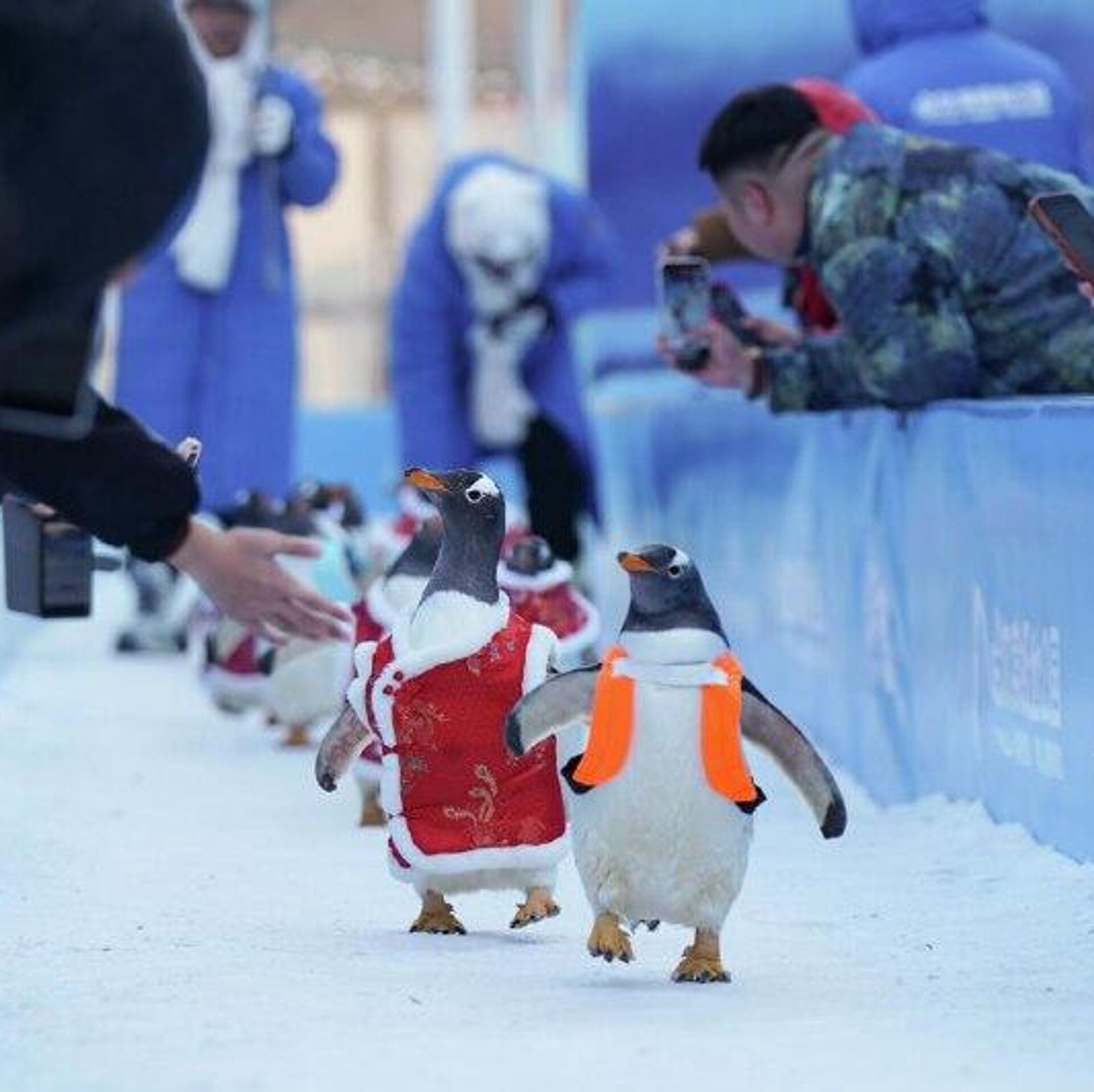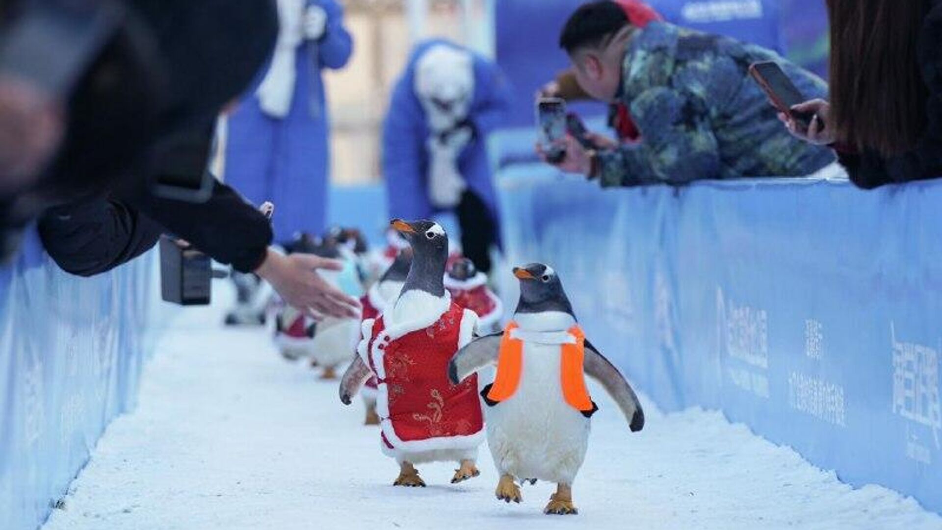 1) گردشگران در حال تماشای رژه پنگوئنها در پارک قطبی هاربین در چین