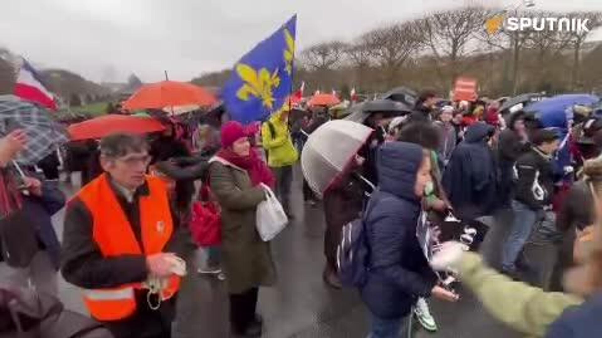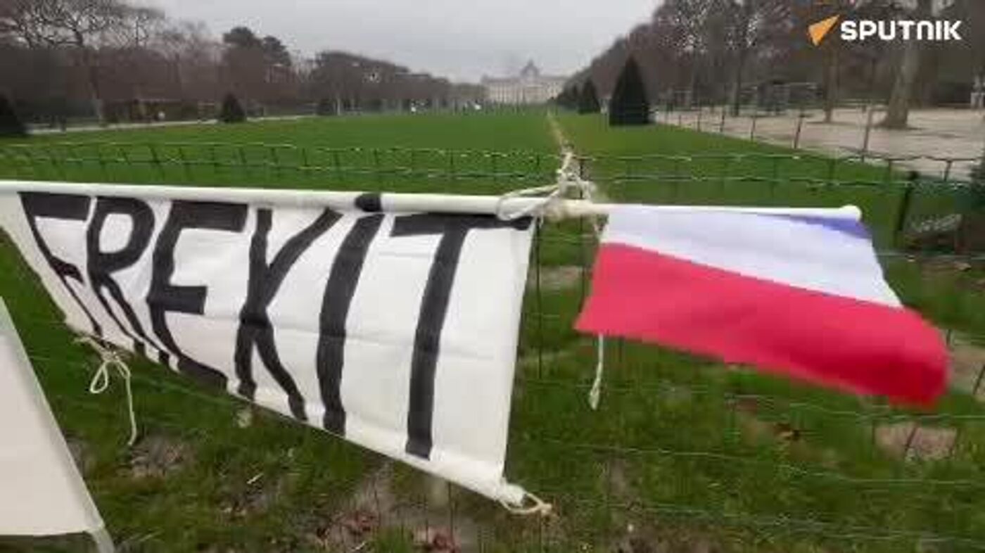 تجمعی علیه سانسور و برای خروج فرانسه از اتحادیه اروپا، که توسط حزب میهنپرستان سازماندهی شده بود، در پاریس، نزدیک برج ایفل در حال برگزاری است.