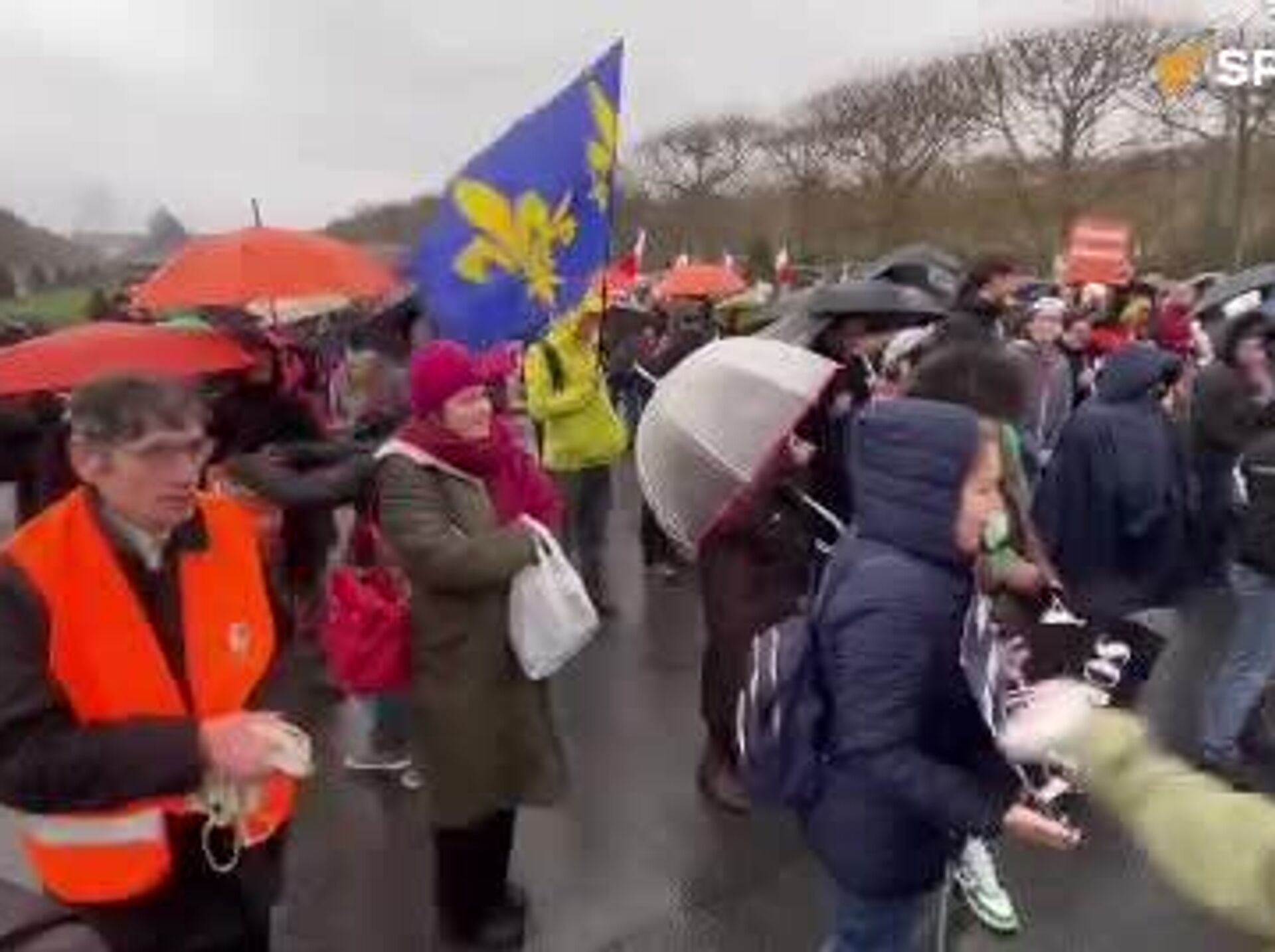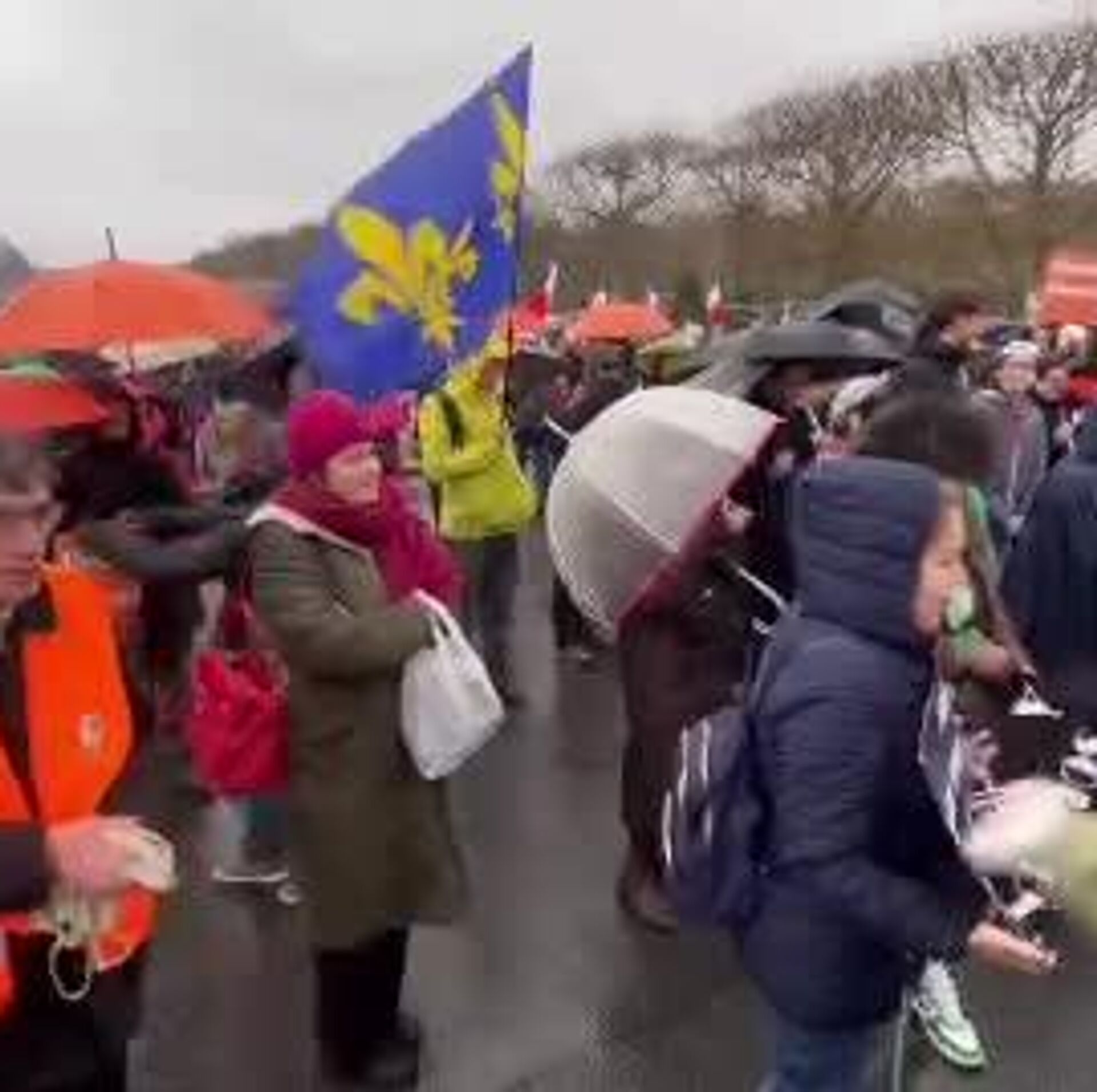 پلاکاردهایی با این مضمون: "زنده باد آزادی بیان!" و "رئیس جمهور را برکنار کنید! همچنین شعارهایی چون "فرگزیت!" (خروج فرانسه از اتحادیه اروپا) - تظاهرکنندگان با تکان دادن پرچمهای فرانسه شعار میدادند.