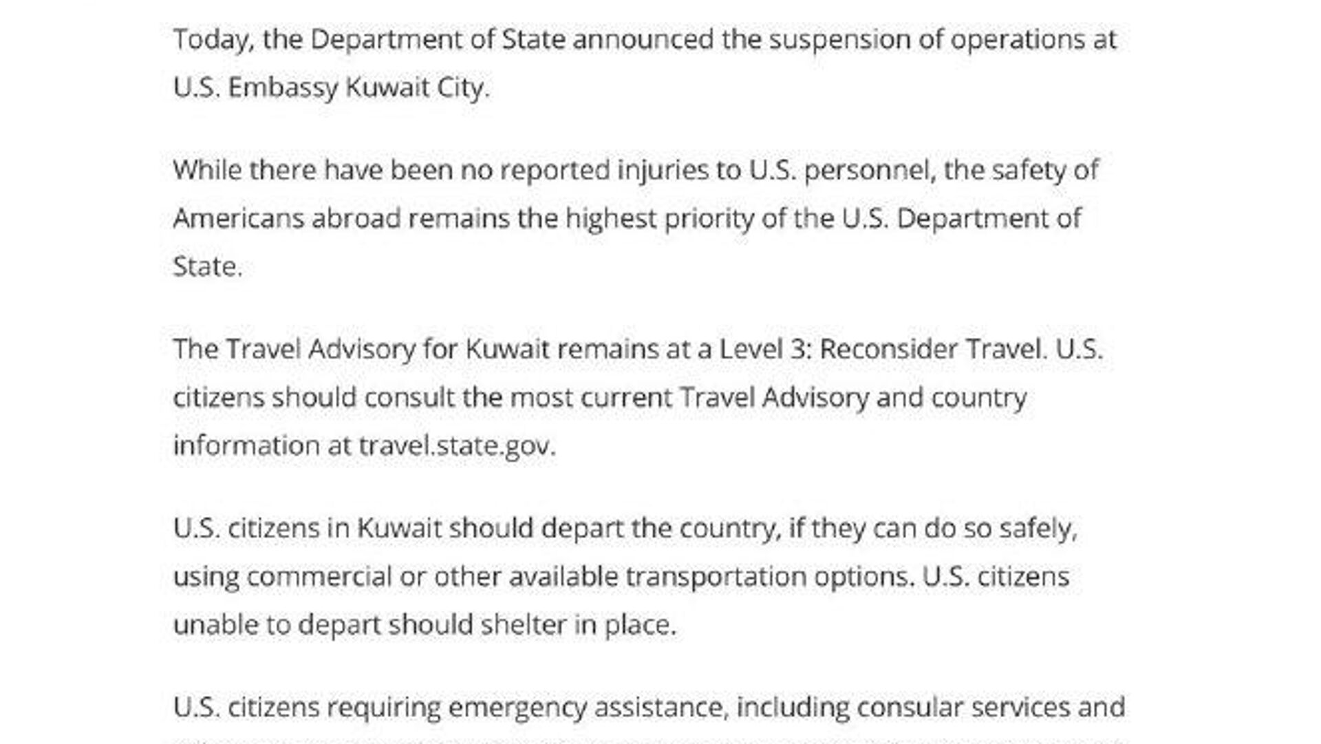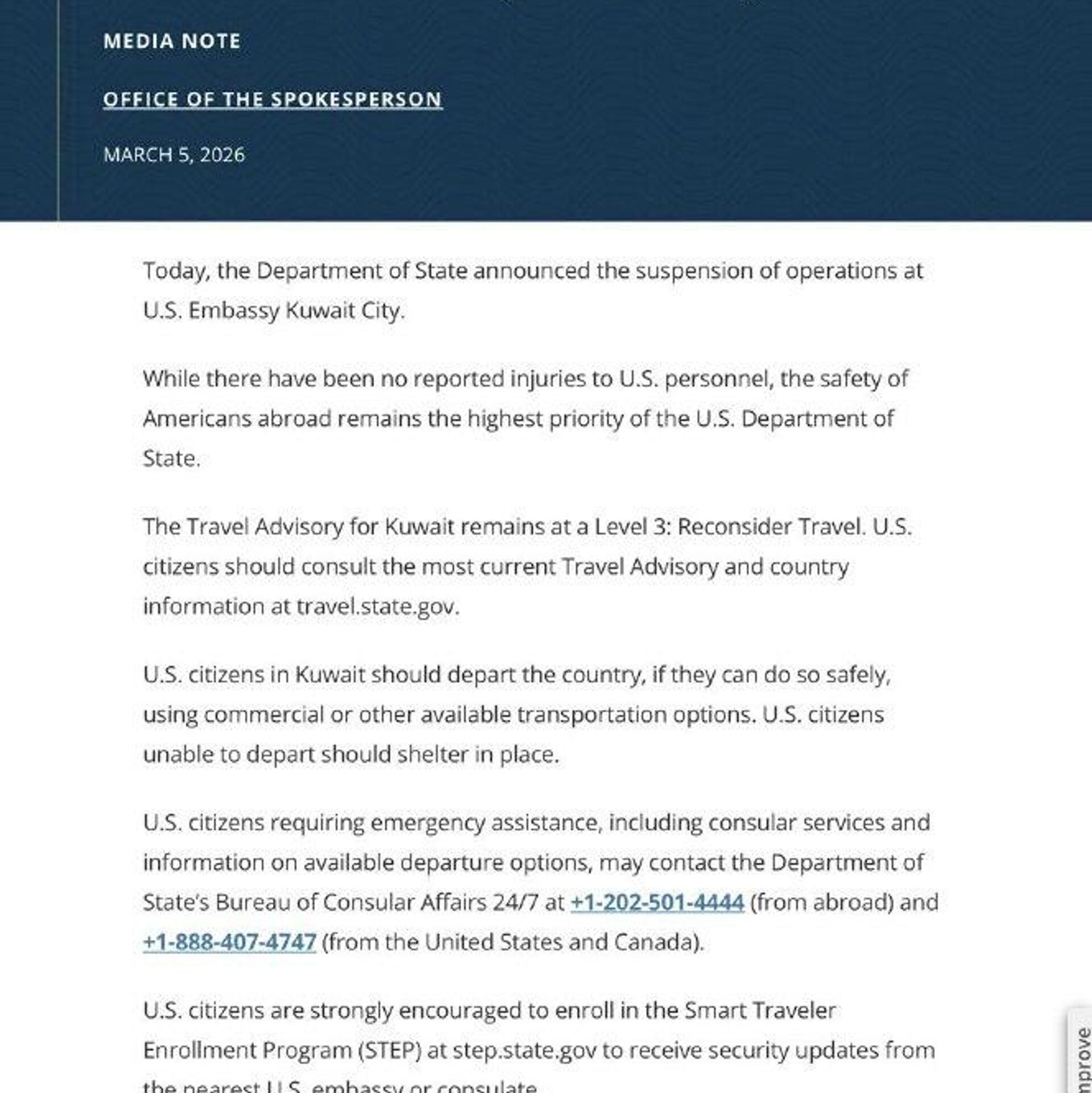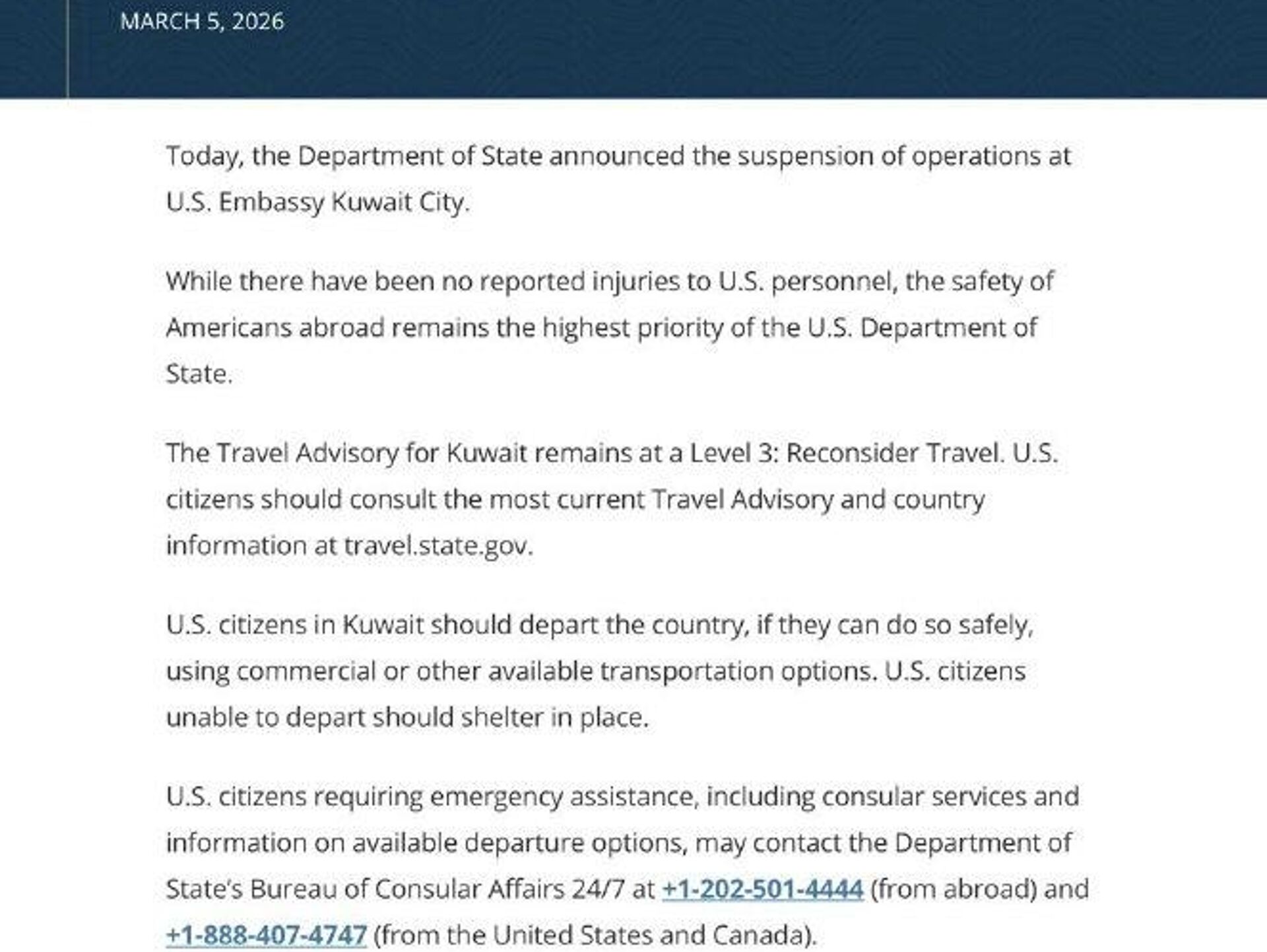 وزارت امور خارجه ایالات متحده در بیانیهای که در تاریخ 5 مارس منتشر شد، از تعلیق فعالیت سفارت آمریکا در شهر کویت خبر داد.