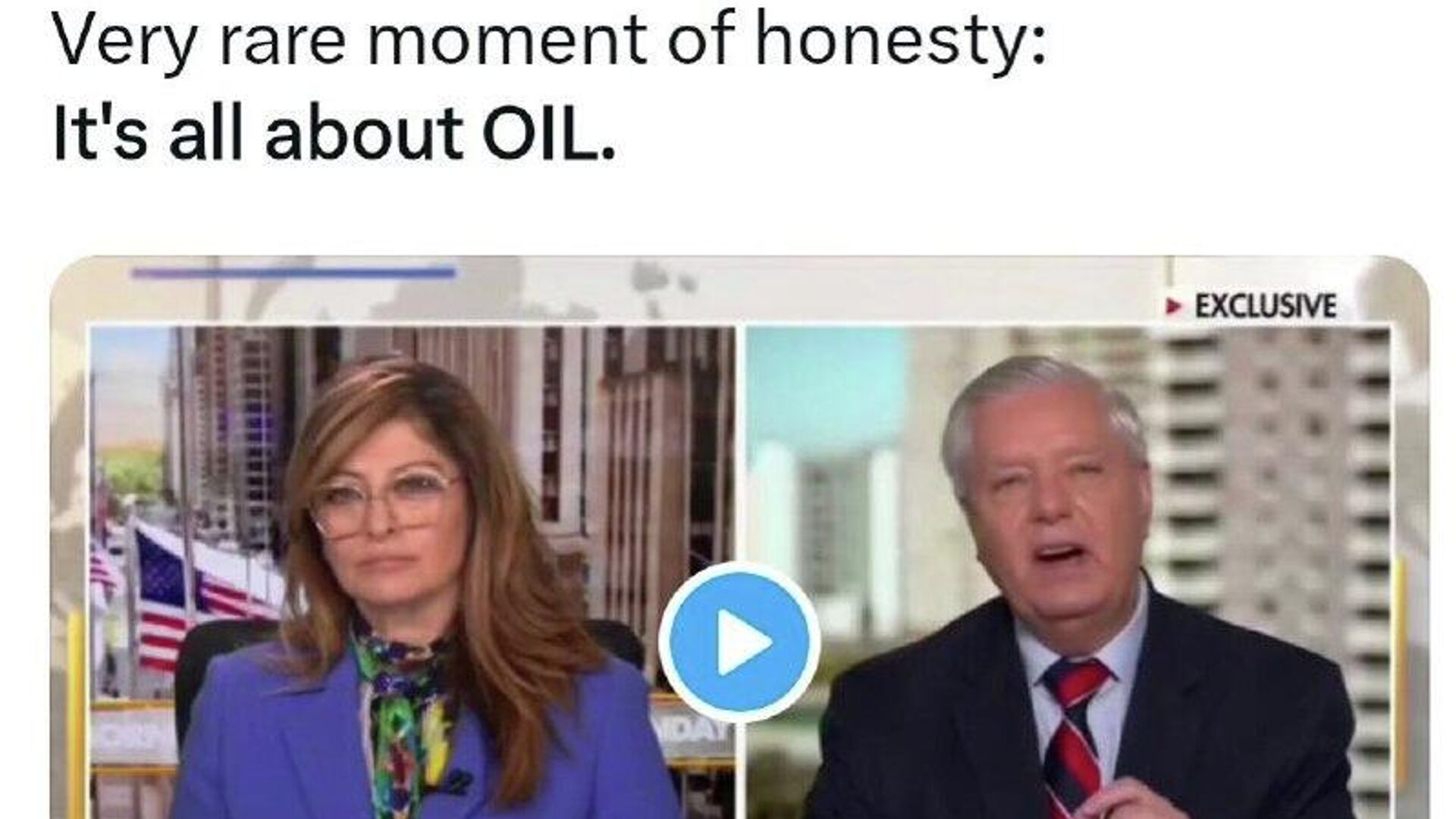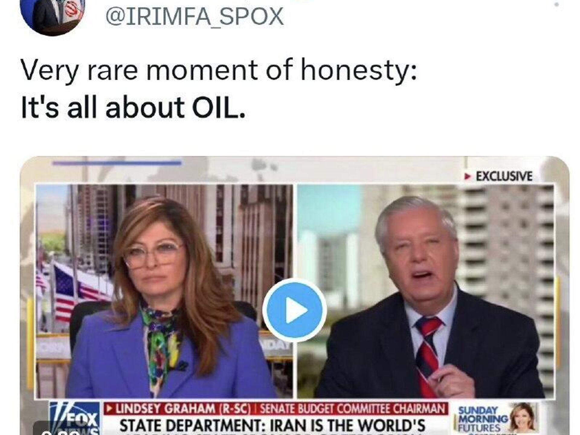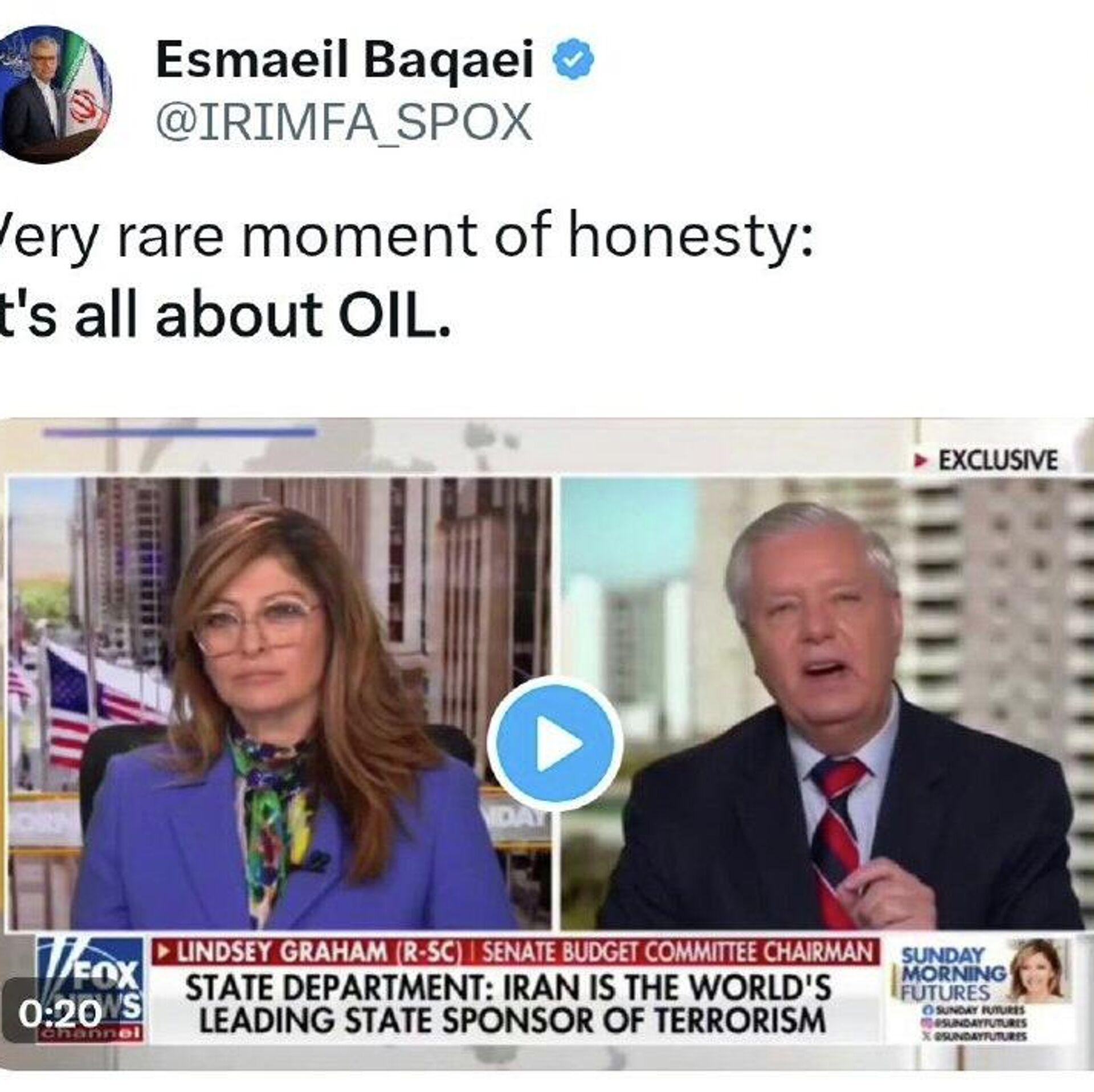 ⭕اسماعیل بقائی، سخنگوی وزارت امور خارجه ایران طی پستی در شبکه ایکس، با به اشتراک گذاشتن فیلمی از اظهارات سناتور لیندسی گراهام، که میگوید، «ونزوئلا و ایران 31 درصد از ذخایر نفت جهان را در اختیار دارند و ما در آنها شراکت خواهیم داشت، نوشت: یک لحظه نادر از راستگویی: مسئله فقط نفت است
