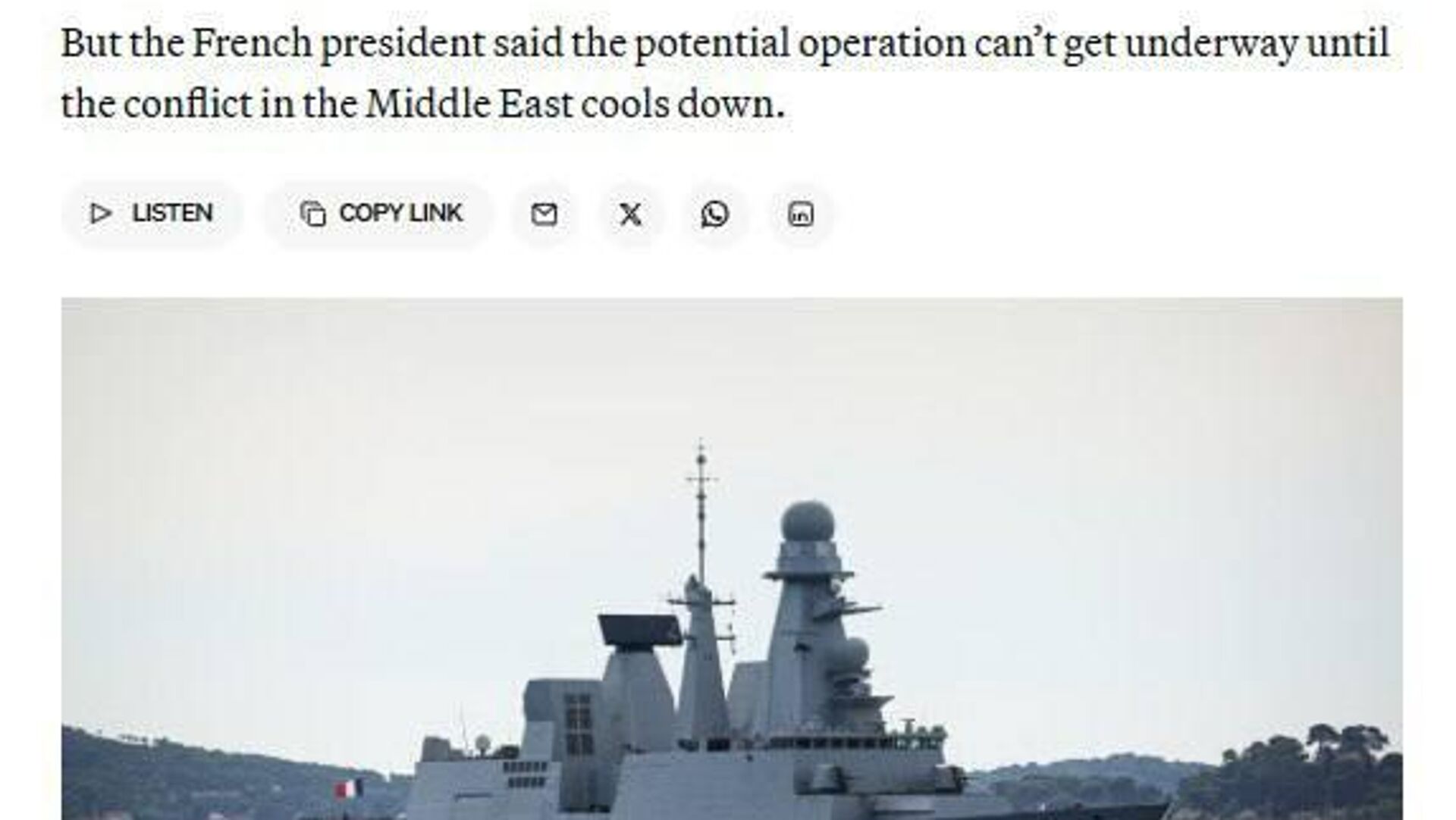 رئیس جمهور فرانسه در دیدار با نخست وزیر یونان و رئیس جمهور قبرس در یک پایگاه نظامی، در این مورد گفتگو کرد. انتظار میرود کشورهای اروپایی و غیراروپایی در این امر مشارکت داشته باشند. با این حال، مکرون خاطرنشان کرد که این عملیات تا زمانی که درگیریها در خاورمیانه فروکش نکند، نمیتواند آغاز شود.