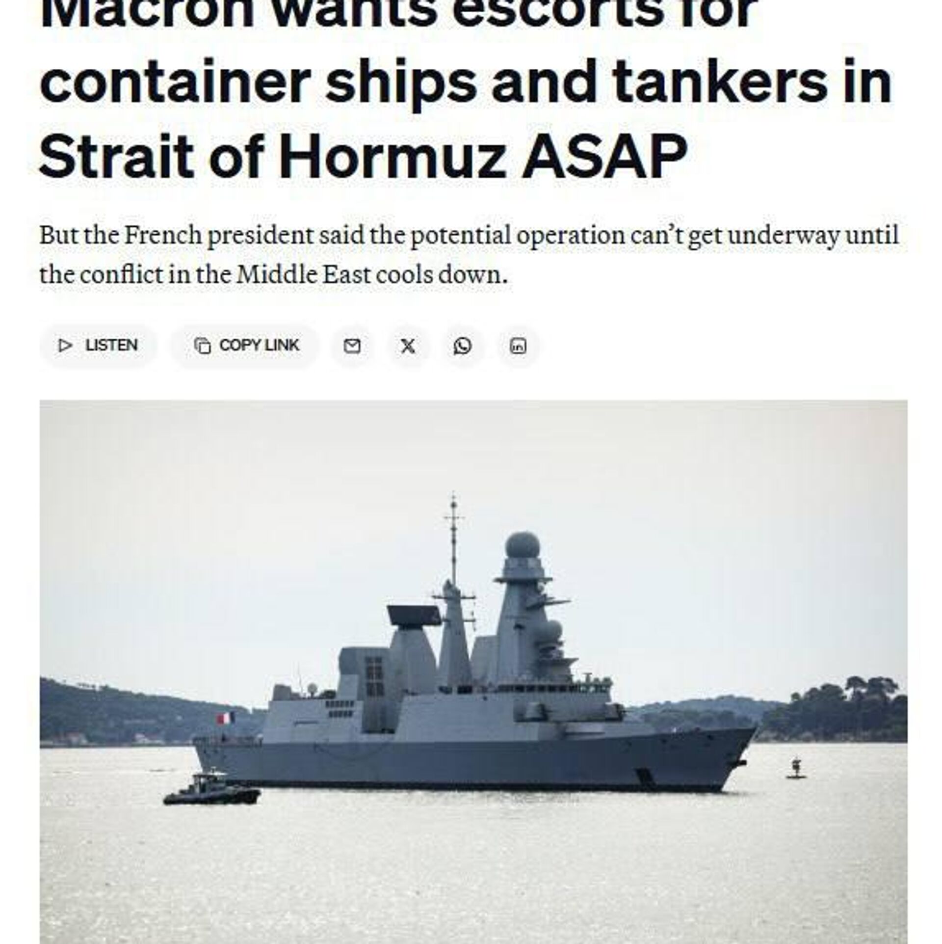 رسانه غربی نوشت که مکرون قصد دارد که اسکورت نظامی برای نفتکشها در تنگه هرمز ترتیب دهد