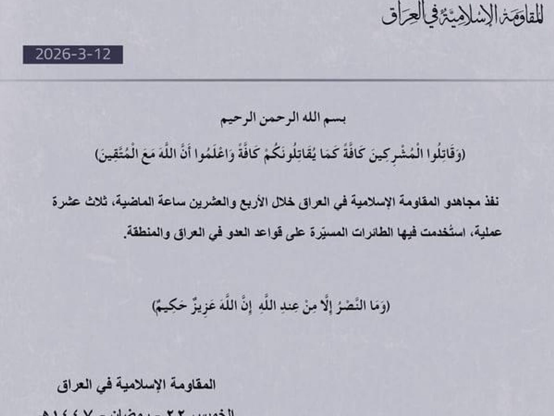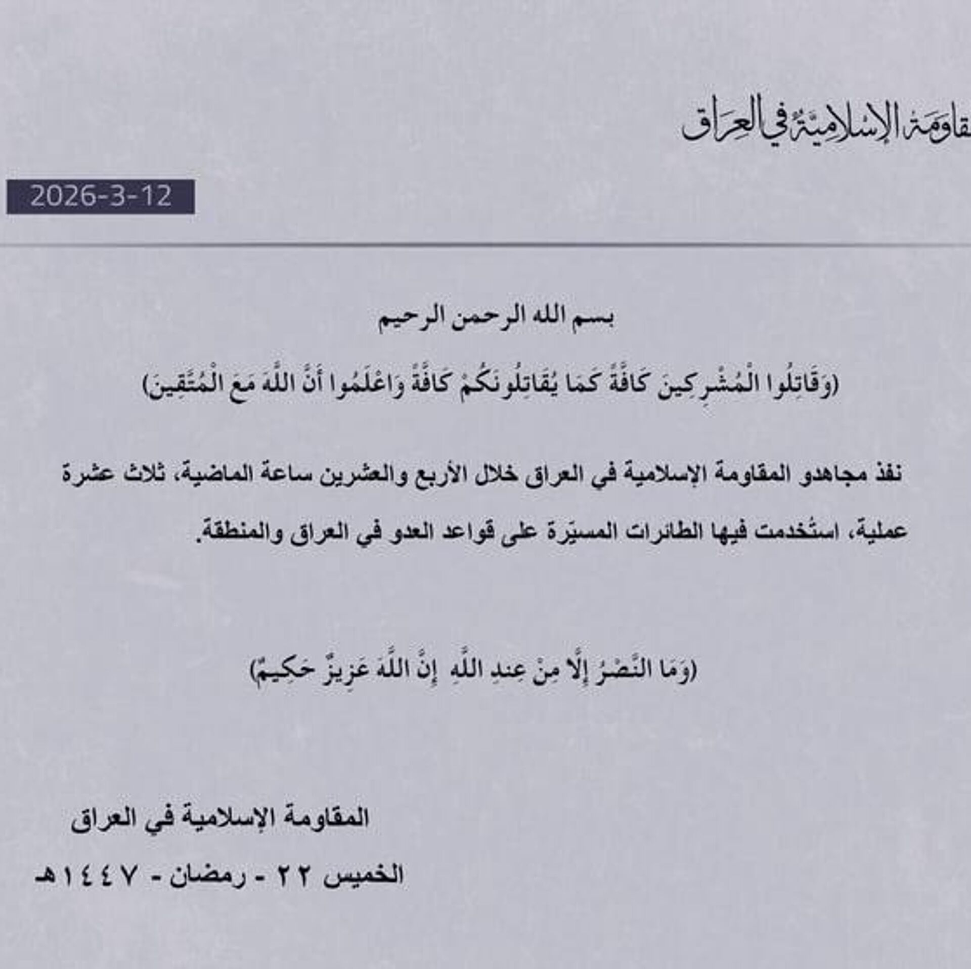 05:33 12.03.2026 (بروز رسانی شده: 05:40 12.03.2026) مقاومت اسلامی عراق بامداد پنجشنبه اعلام کرد که طی 24 ساعت گذشته، 13 عملیات پهپادی علیه مواضع آمریکایی انجام داده است