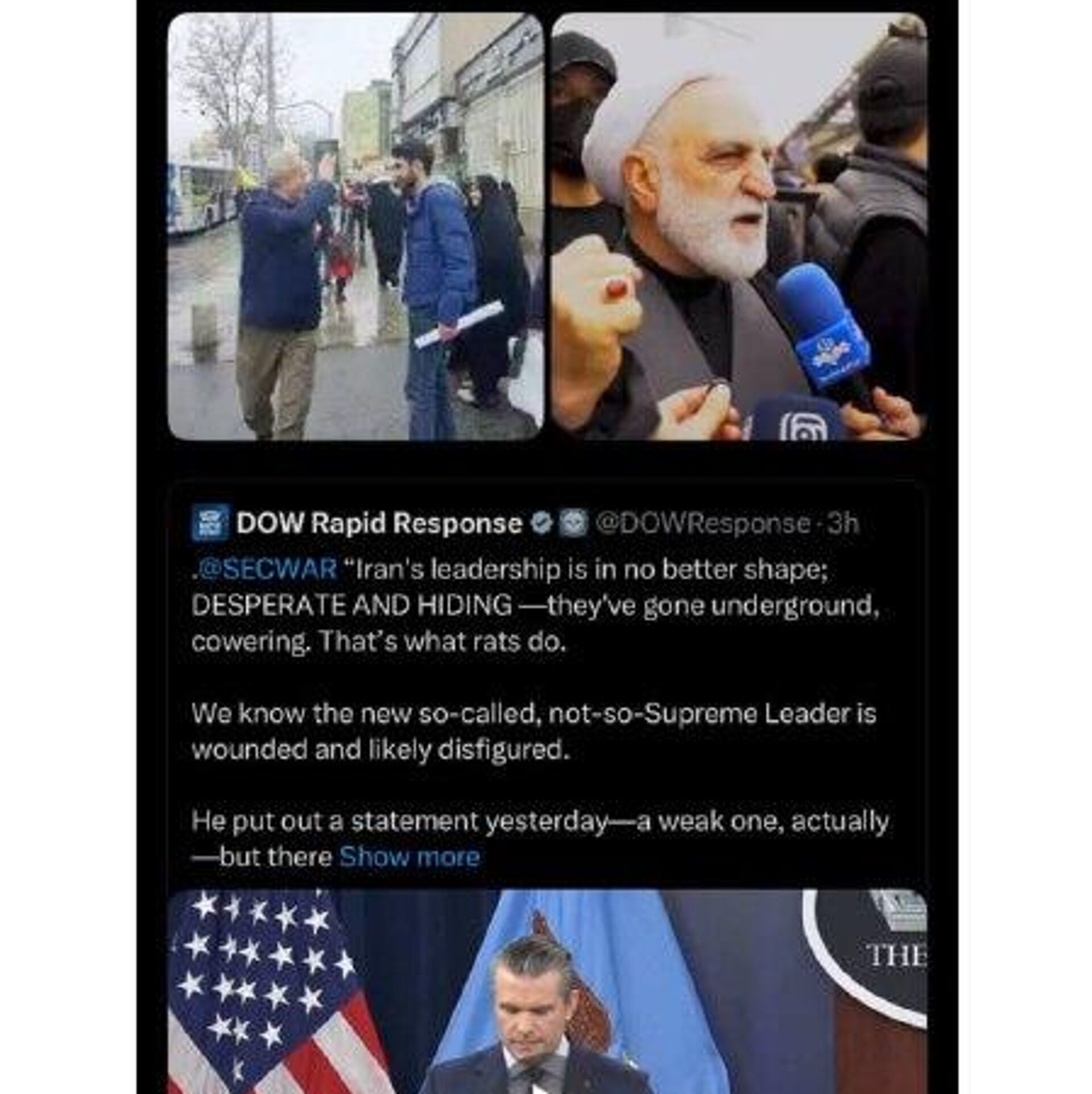 علی لاریجانی، دبیر شورای عالی امنیت ملی ایران: آقای هگست! رهبران ما در همه این سالها در بین مردم بودهاند و هستند؛ اما رهبران شما در جزیره اپستین!