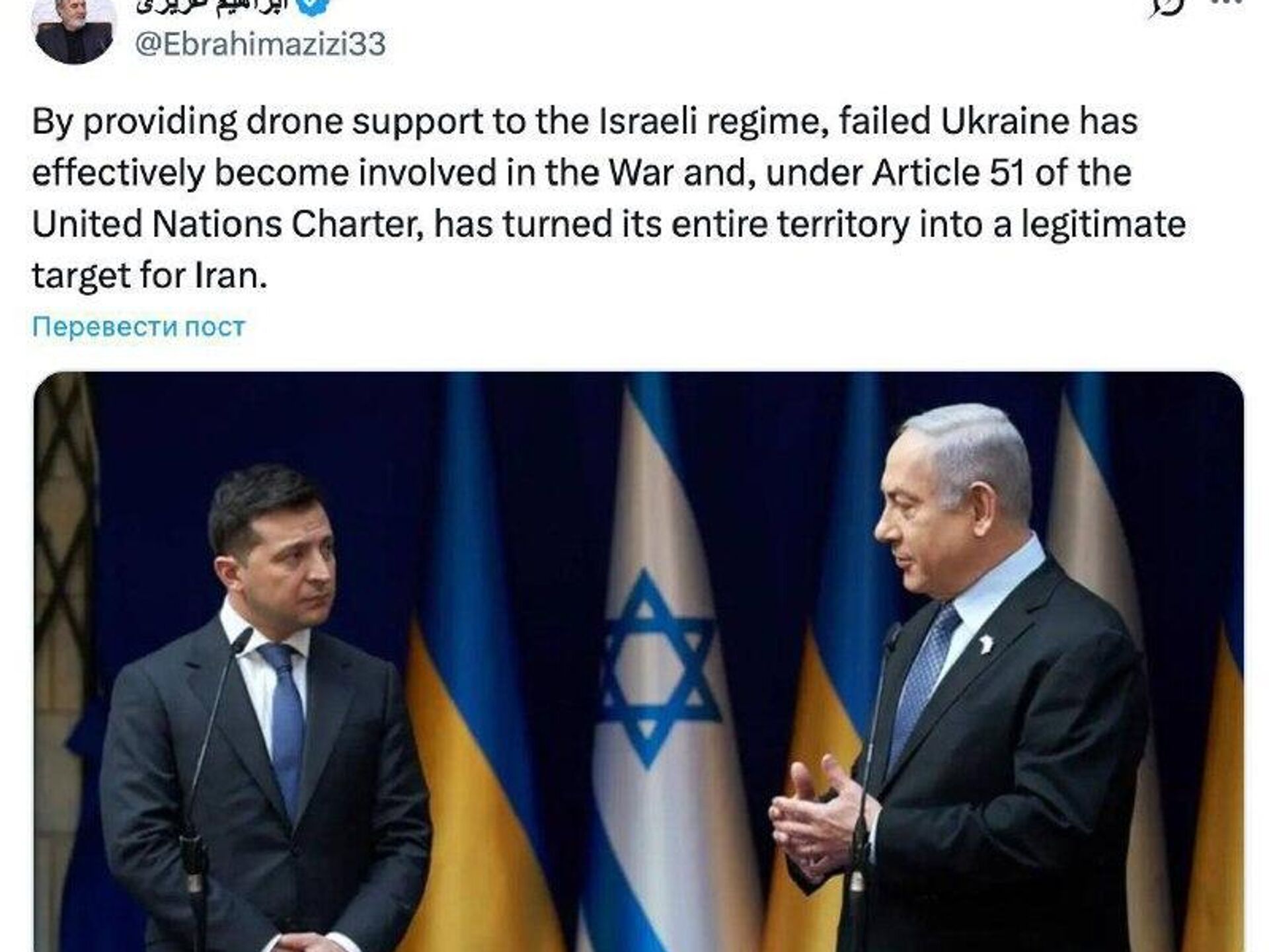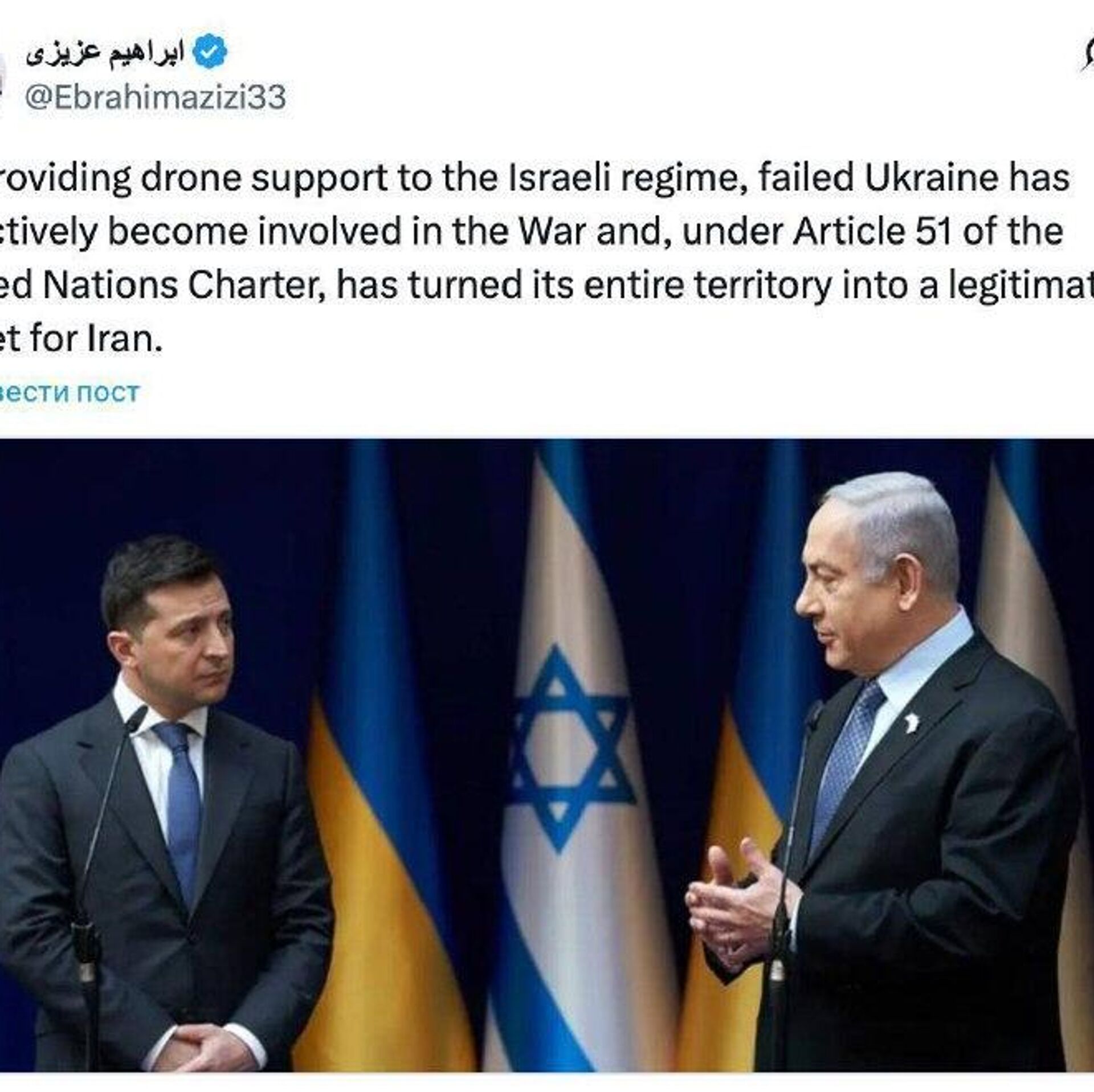 ابراهیم عزیزی، رئیس کمیسیون امنیت ملی مجلس ایران، در ایکس نوشت: کییف به دلیل ارائه پشتیبانی پهپادی به اسرائیل، عملاً به یکی از طرفین جنگ تبدیل شده است.