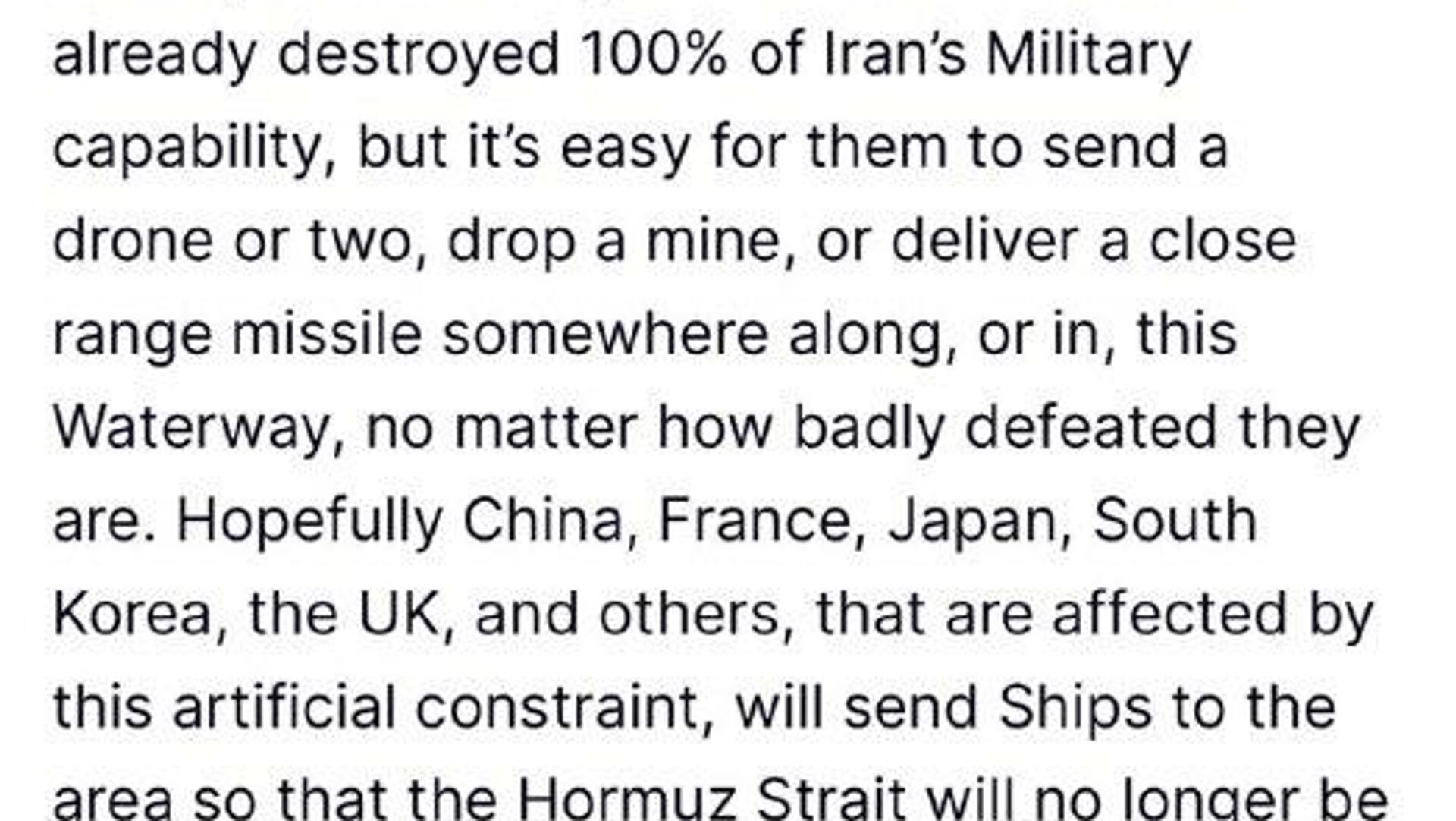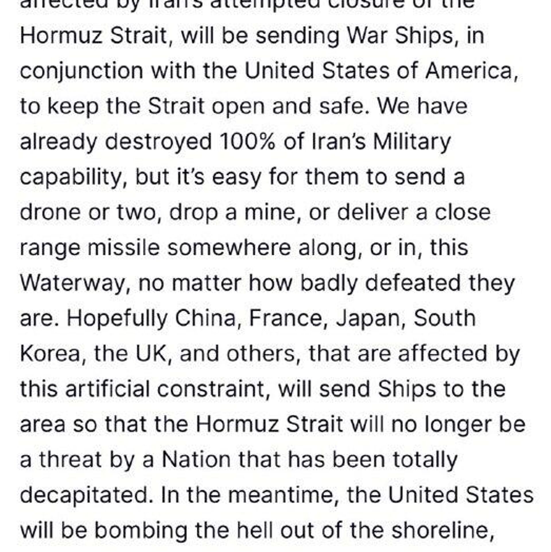 ترامپ قول داد که ایالات متحده آمریکا برای تضمین عبور امن از تنگه هرمز. به بمباران خط ساحلی ایران ادامه خواهد داد