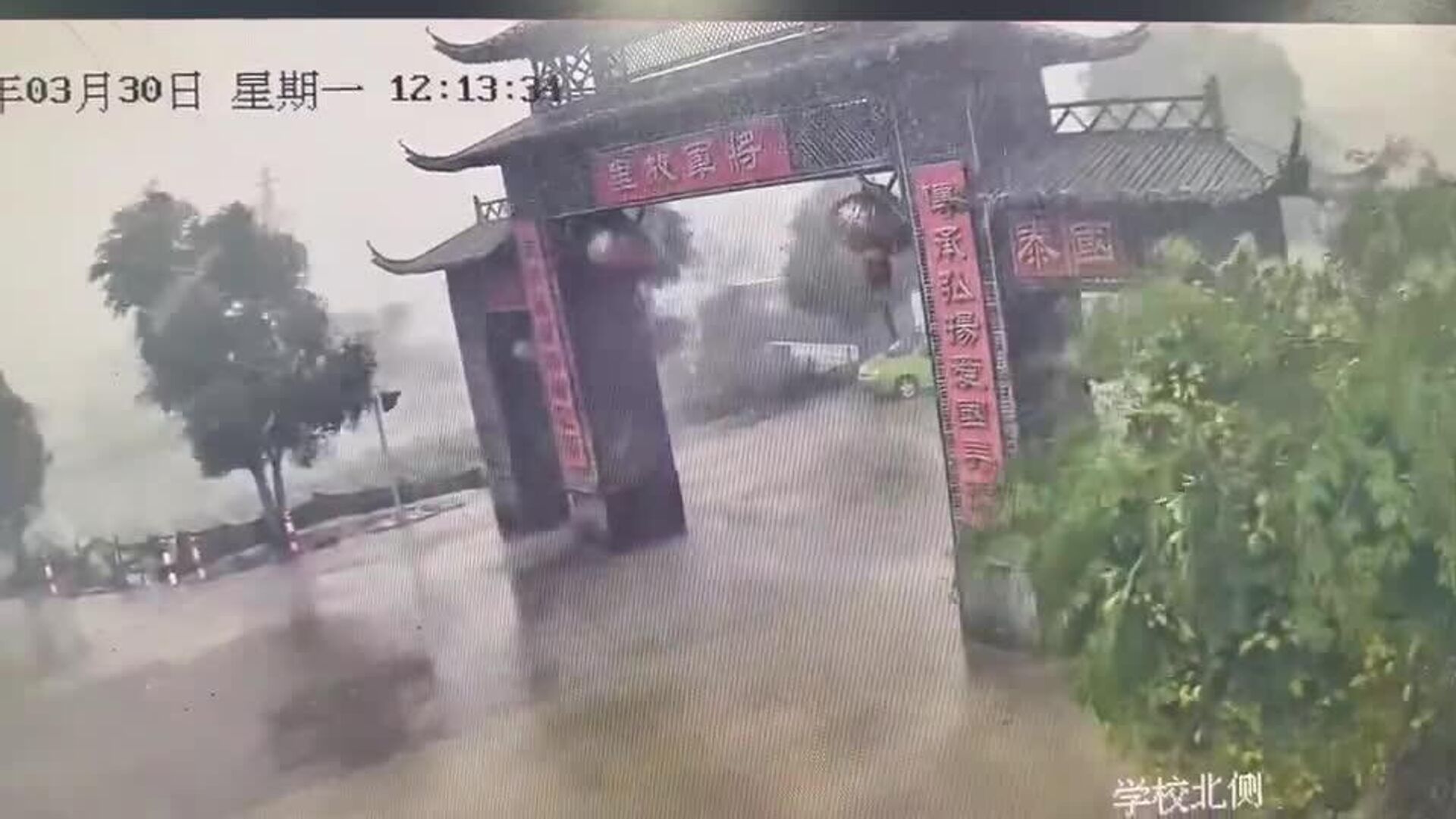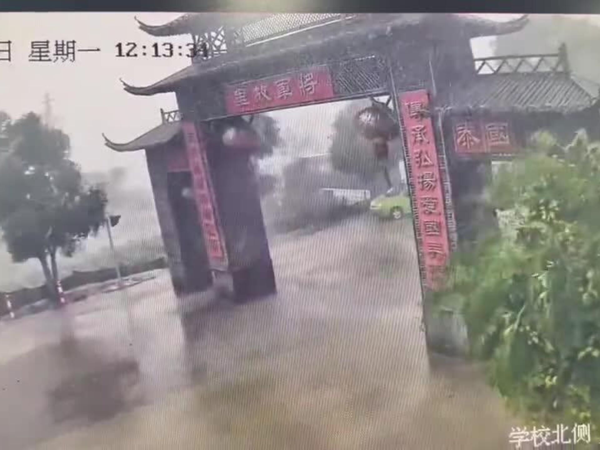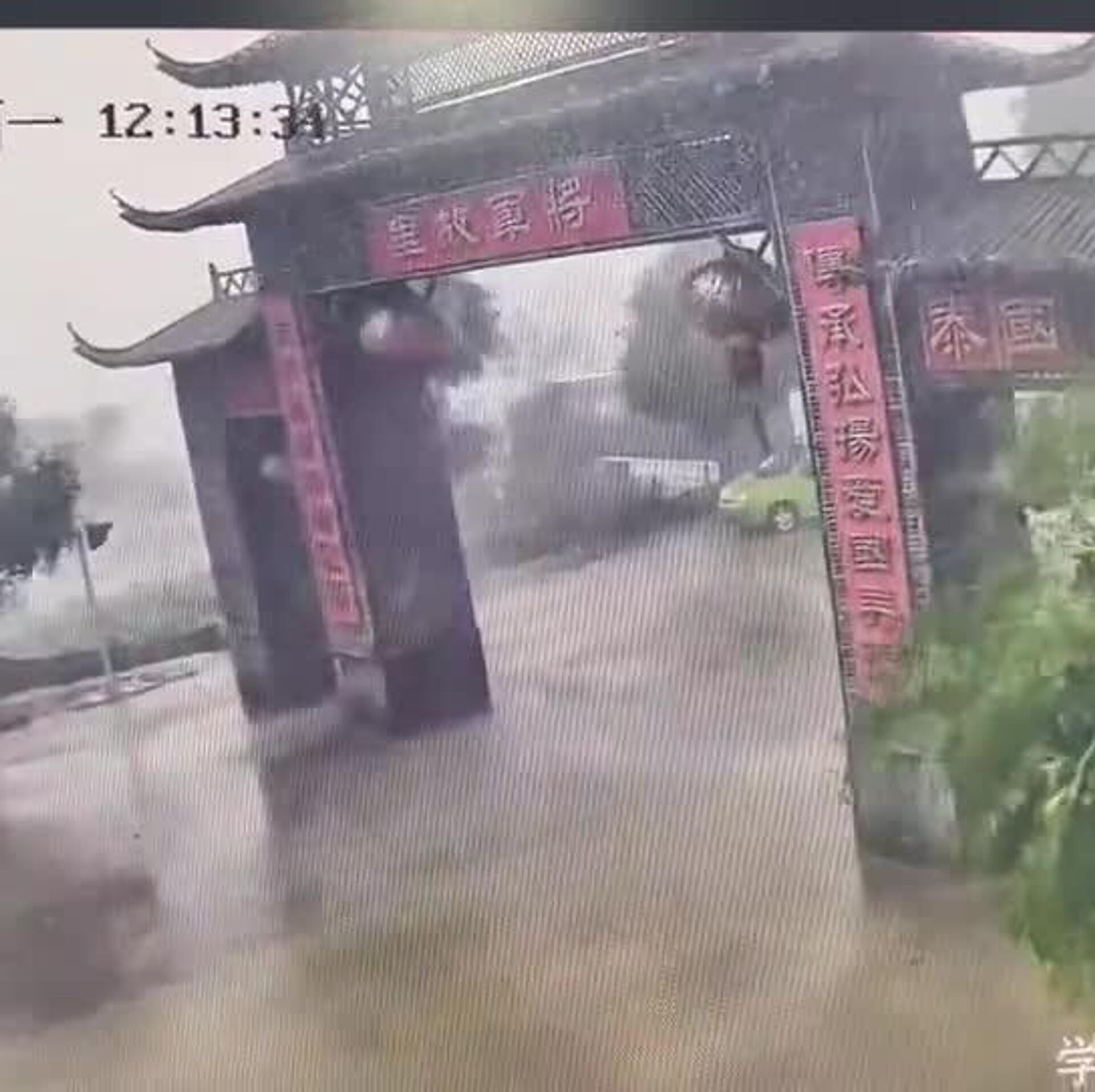 فرو ریختن یک دروازه باستانی در چین به دلیل طوفان که کم مانده بود روی یک رهگذر بیفتد