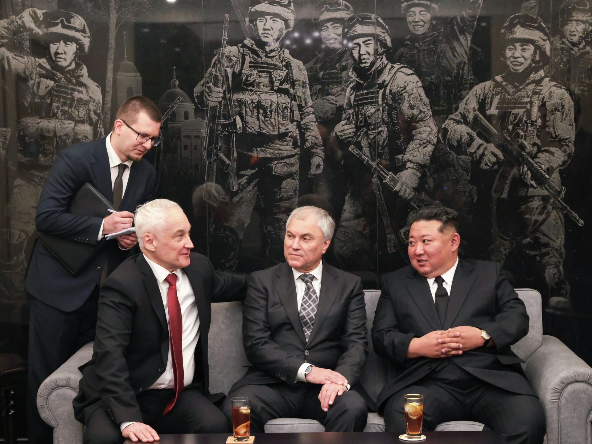 به گزارش خبرگزاری ملی کره شمالی، کیم جونگ اون، رهبر کره شمالی، در تاریخ 27 آوریل در پیونگ یانگ با آندری بلوسوف، وزیر دفاع روسیه و ویاچسلاو ولودین، رئیس دومای دولتی، دیدار کرد. هر دو طرف در مراسم افتتاح موزه یادبود دستاوردهای رزمی در عملیات نظامی برون مرزی شرکت کردند.