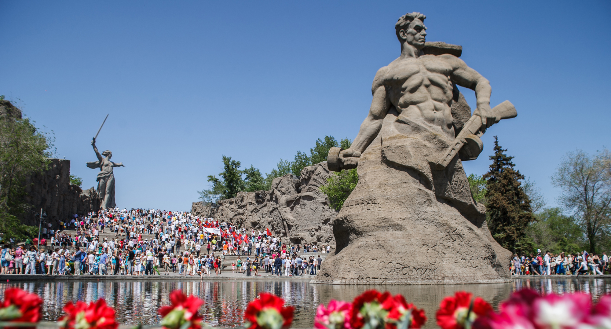 گلها در مجتمع یادبود "مامایف کورگان" در ولگاگراد در جشن روز پیروزی